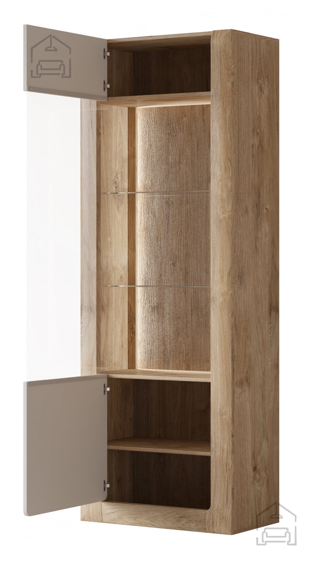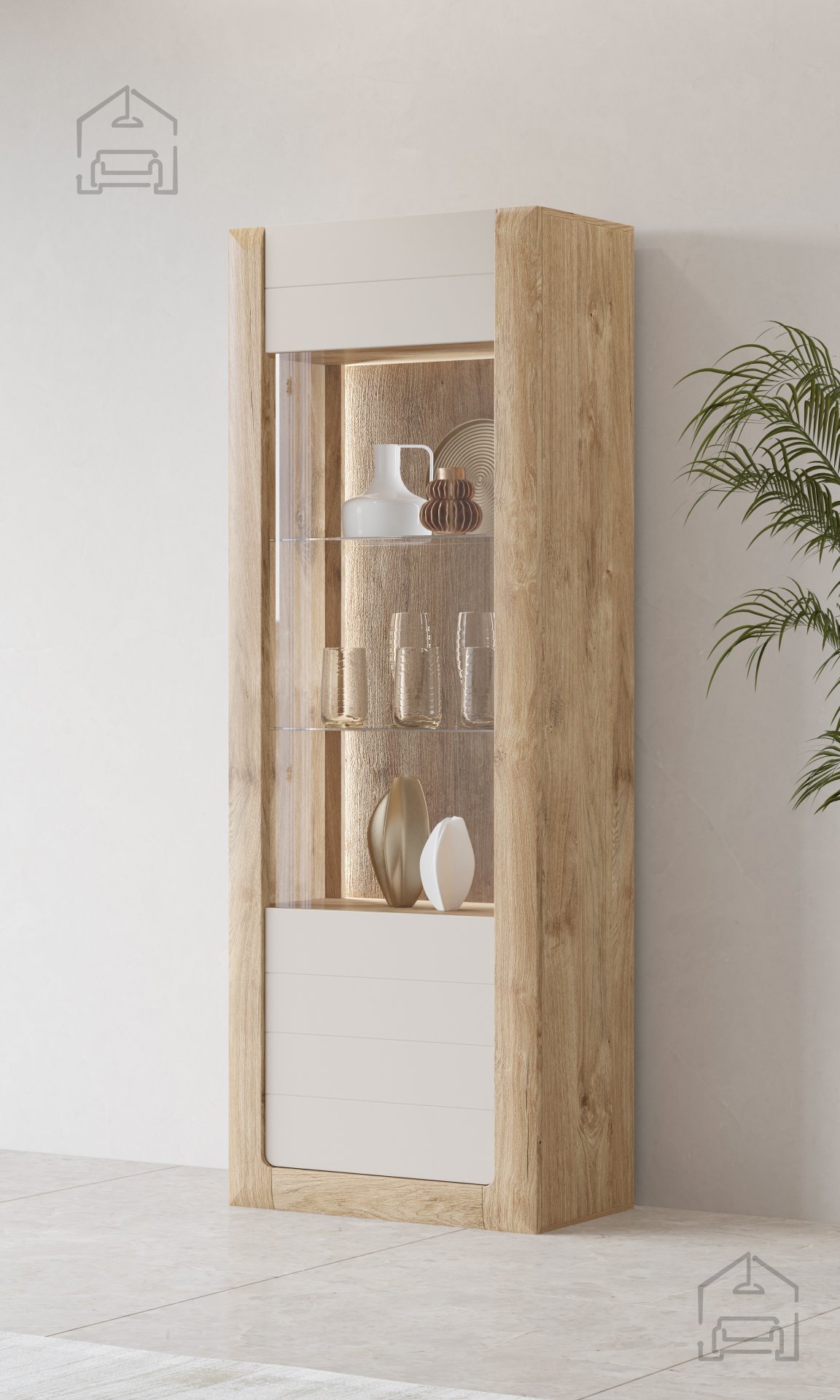 Die Farbkombination aus Gold Harbor Eiche und Perfect Touch Cashmir ist ein wahrer Blickfang. Dieses subtile, aber luxuriöse Farbschema ermöglicht es der Vitrine, sich mühelos an verschiedene Einrichtungsstile anzupassen – von klassisch bis modern. Der Cashmir-Ton verleiht eine weiche und anspruchsvolle Note, während der Gold Harbor Eichenfarbton Wärme und ein natürliches Gefühl in jeden Raum bringt.
