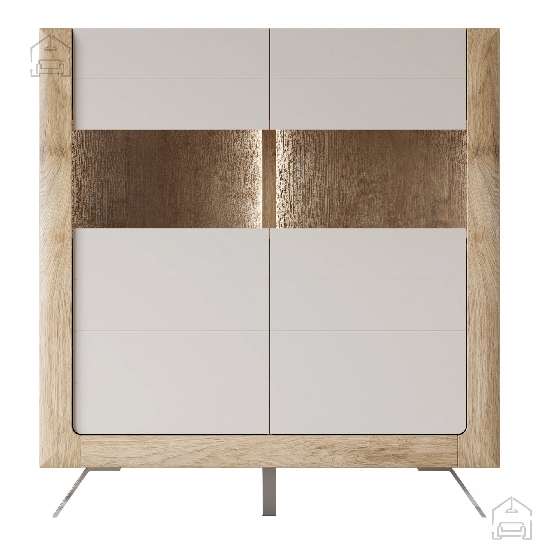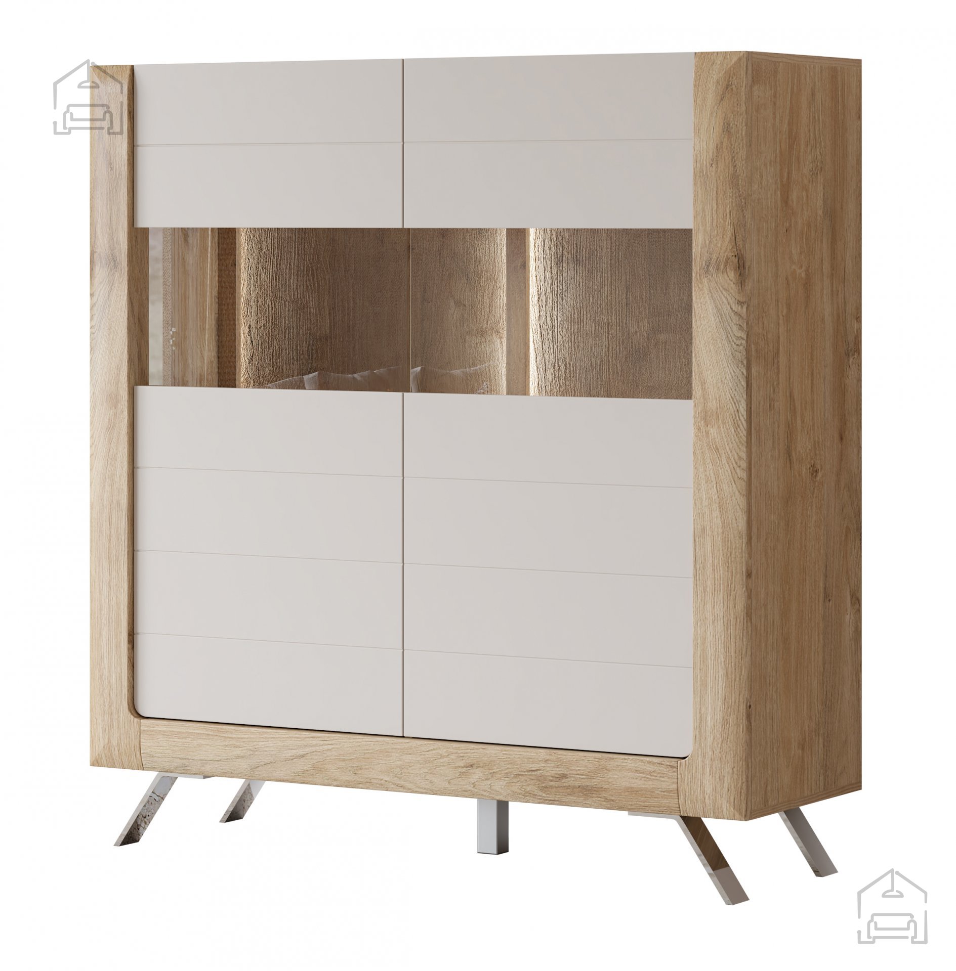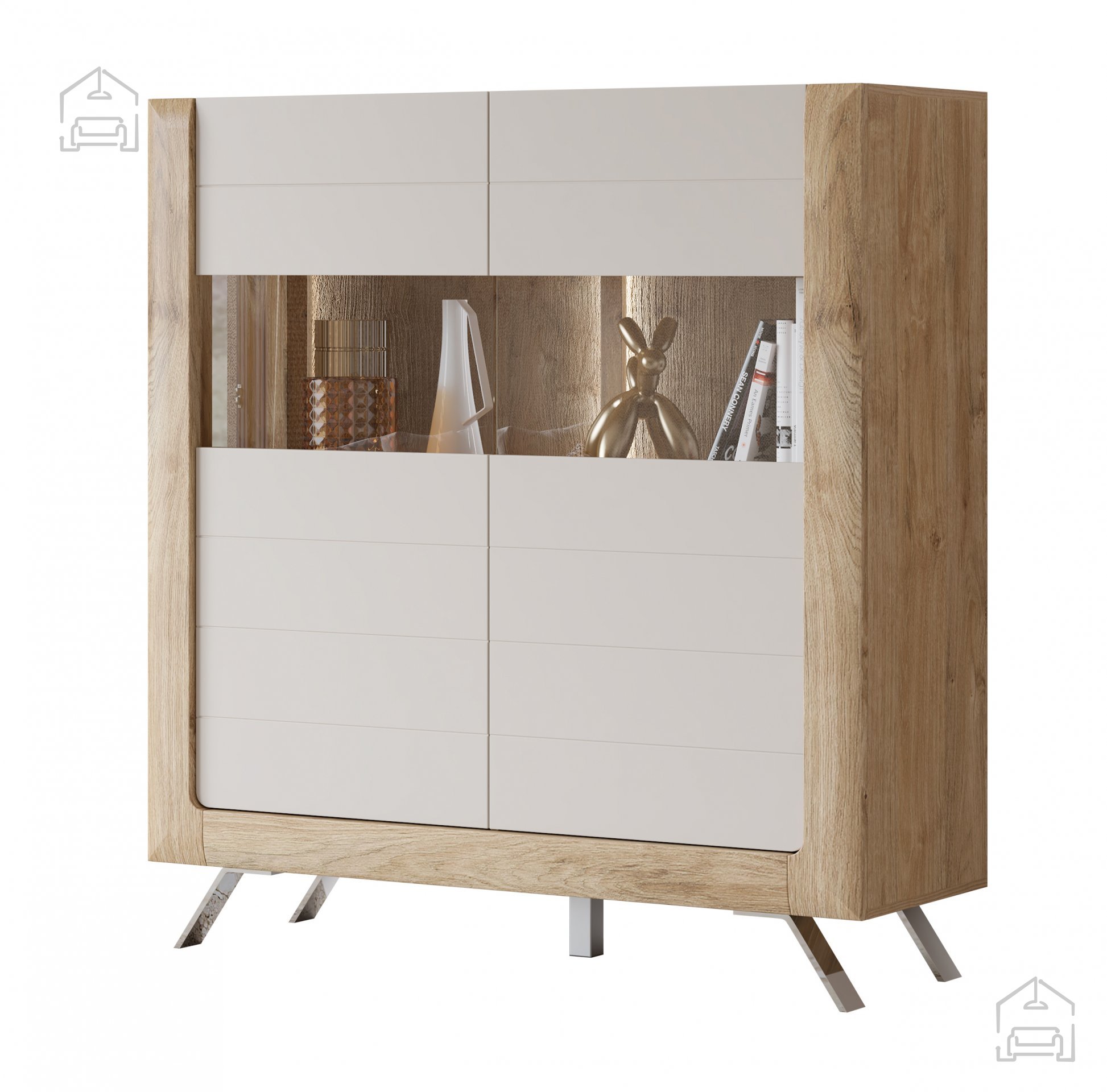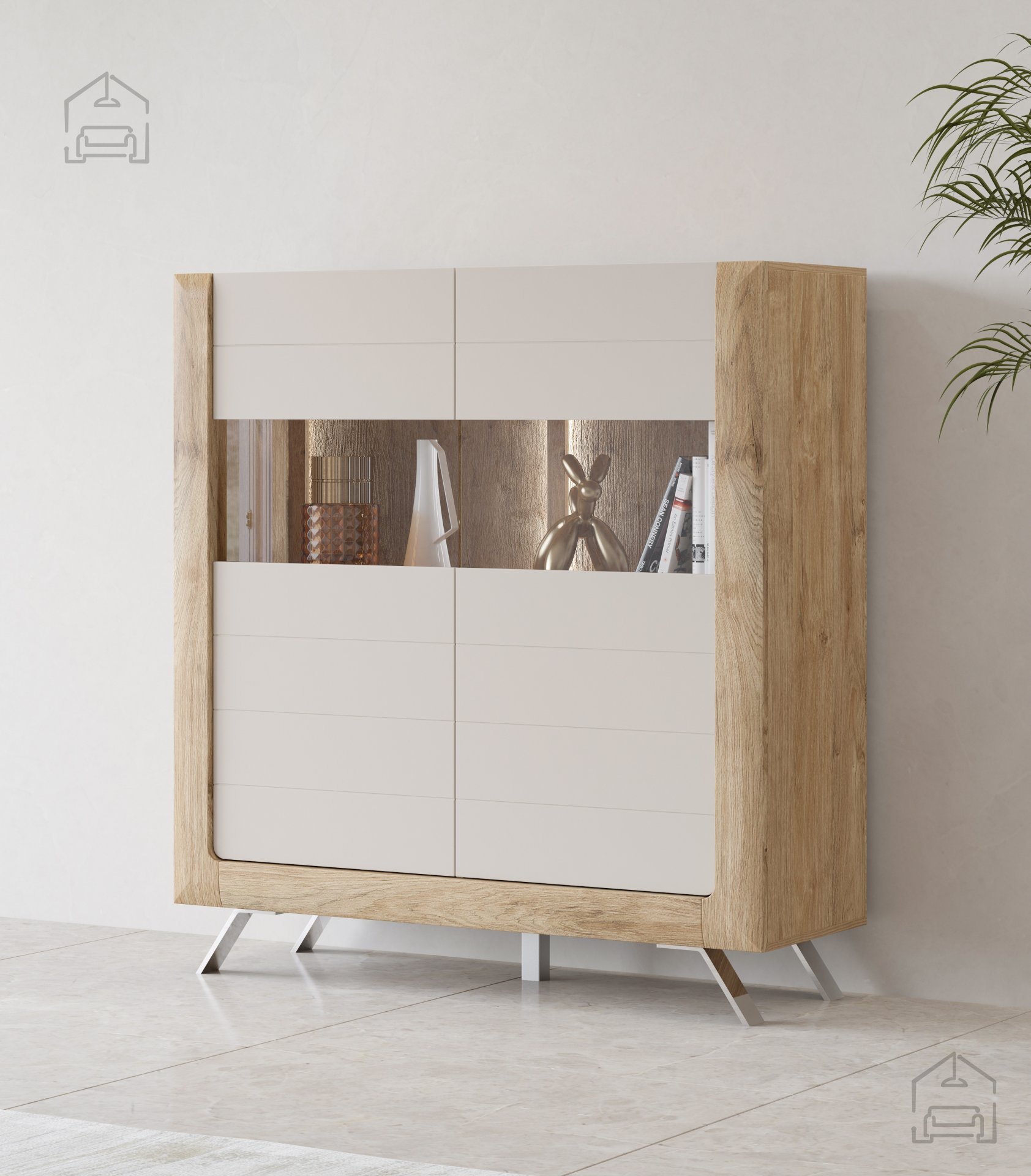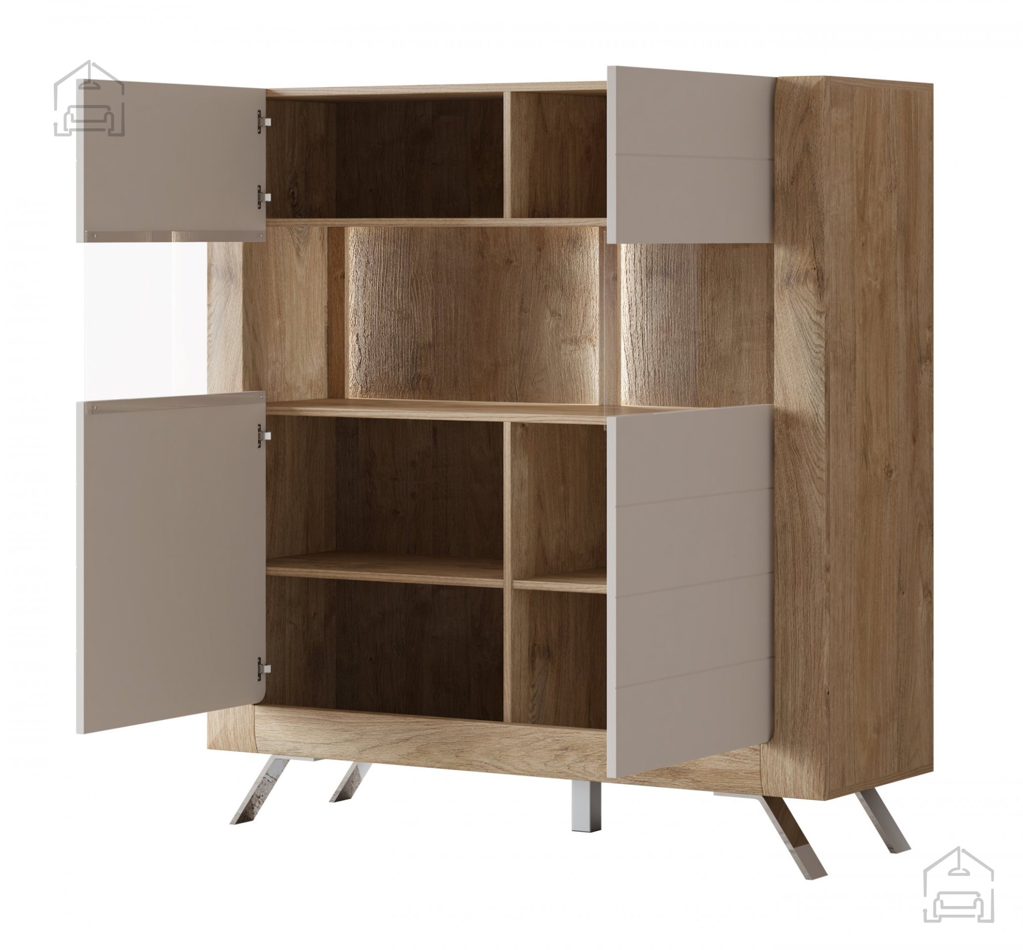 Die zweifarbige Kombination aus Gold Harbor Eiche und Perfect Touch Cashmir verleiht der Vitrine Kasai ein warmes und einladendes Aussehen. Dieses elegante Farbschema ermöglicht eine einfache Abstimmung mit verschiedenen Einrichtungsstilen, von modern bis klassisch. Der Cashmir-Ton bringt eine subtile und raffinierte Note, die sich perfekt in Ihre bestehende Einrichtung einfügt.