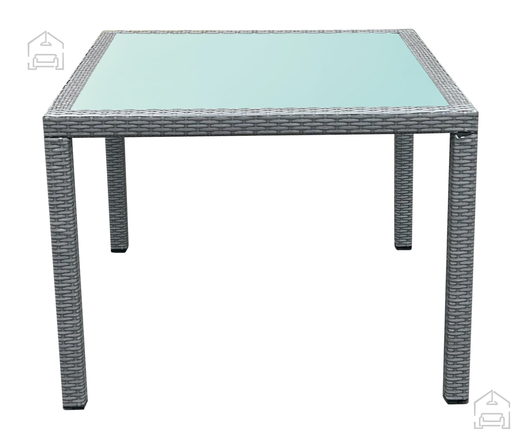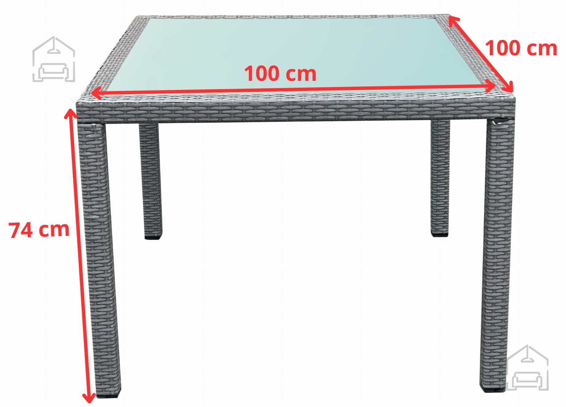 Das Gestell des Tisches besteht aus leichtem, aber stabilem Aluminium, das für sicheren Stand und müheloses Umstellen sorgt. Aluminium rostet nicht und bleibt daher auch nach mehreren Saisonen im Freien optisch einwandfrei. Der Rahmen ist mit grauem Polyrattan umflochten, dessen Bänder etwa 7–8 x 1,2 mm messen. Dieses Material ist besonders widerstandsfähig gegen UV-Strahlung, Temperaturschwankungen und Frost, nimmt keine Feuchtigkeit auf und behält Farbe sowie Form über lange Zeit. Die Tischplatte aus robustem Glas liegt auf rutschfesten Pads auf, was zusätzliche Sicherheit bietet und ein Verrutschen beim Gebrauch verhindert.