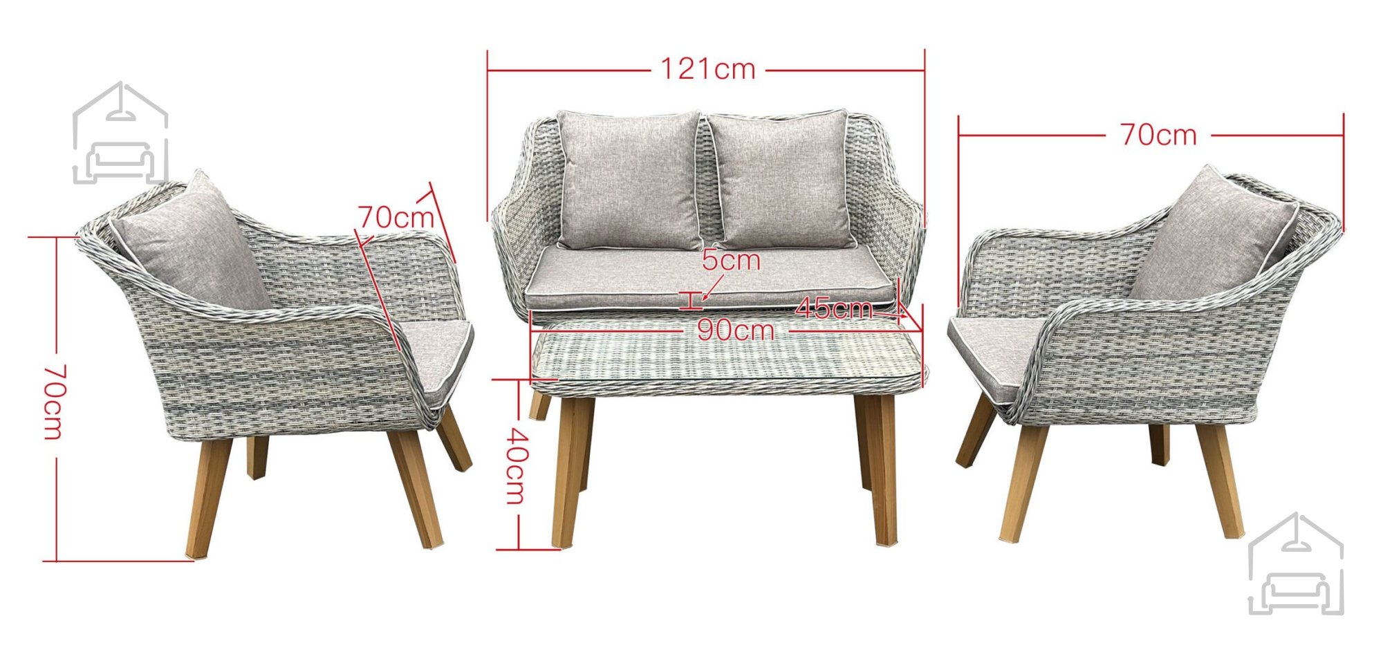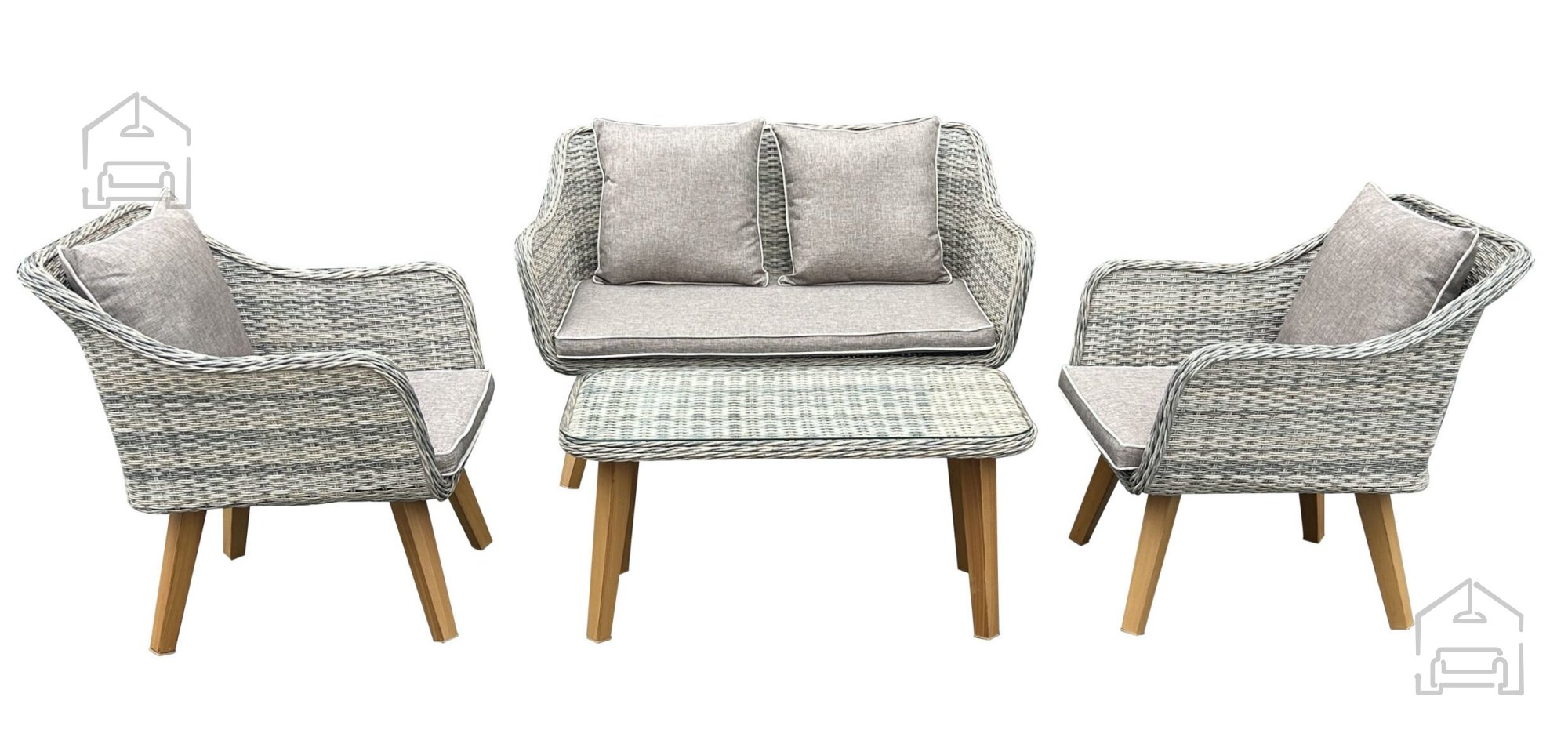 Das Set besteht aus vier Basisteilen, die zusammen eine perfekte Sitzgruppe für kleinere Terrassen oder großzügige Gärten bilden:
