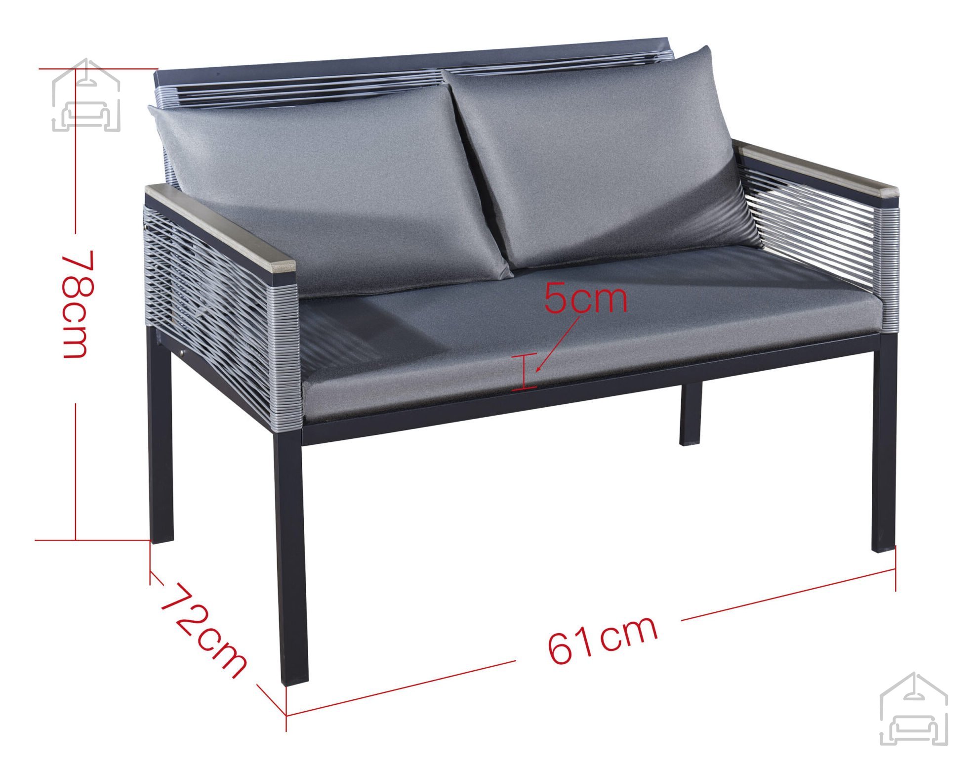 Die Linien des Gartensets Corto sind schlicht, aber elegant. Das Metallgestell betont den modernen Charakter, während die symmetrischen Formen für ein ausgewogenes Gesamtbild sorgen. Die graue Farbe verleiht eine dezente Eleganz, die sowohl zu urbanem Stil als auch zu naturnahen Gärten passt. Mit farbigen Kissen lässt sich das Set individuell gestalten und leicht an den persönlichen Geschmack oder saisonale Trends anpassen.