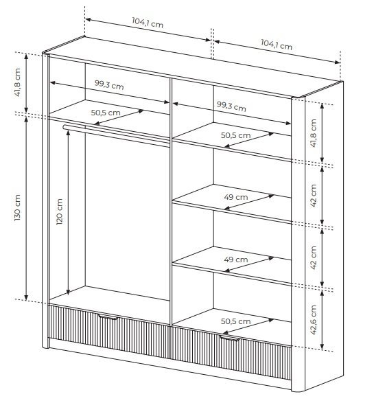 Die Scharniere, die eine parallele oder doppelte Öffnung der Türen ermöglichen, sind so konzipiert, dass sie einen reibungslosen Betrieb und eine lange Lebensdauer des Schranks gewährleisten.