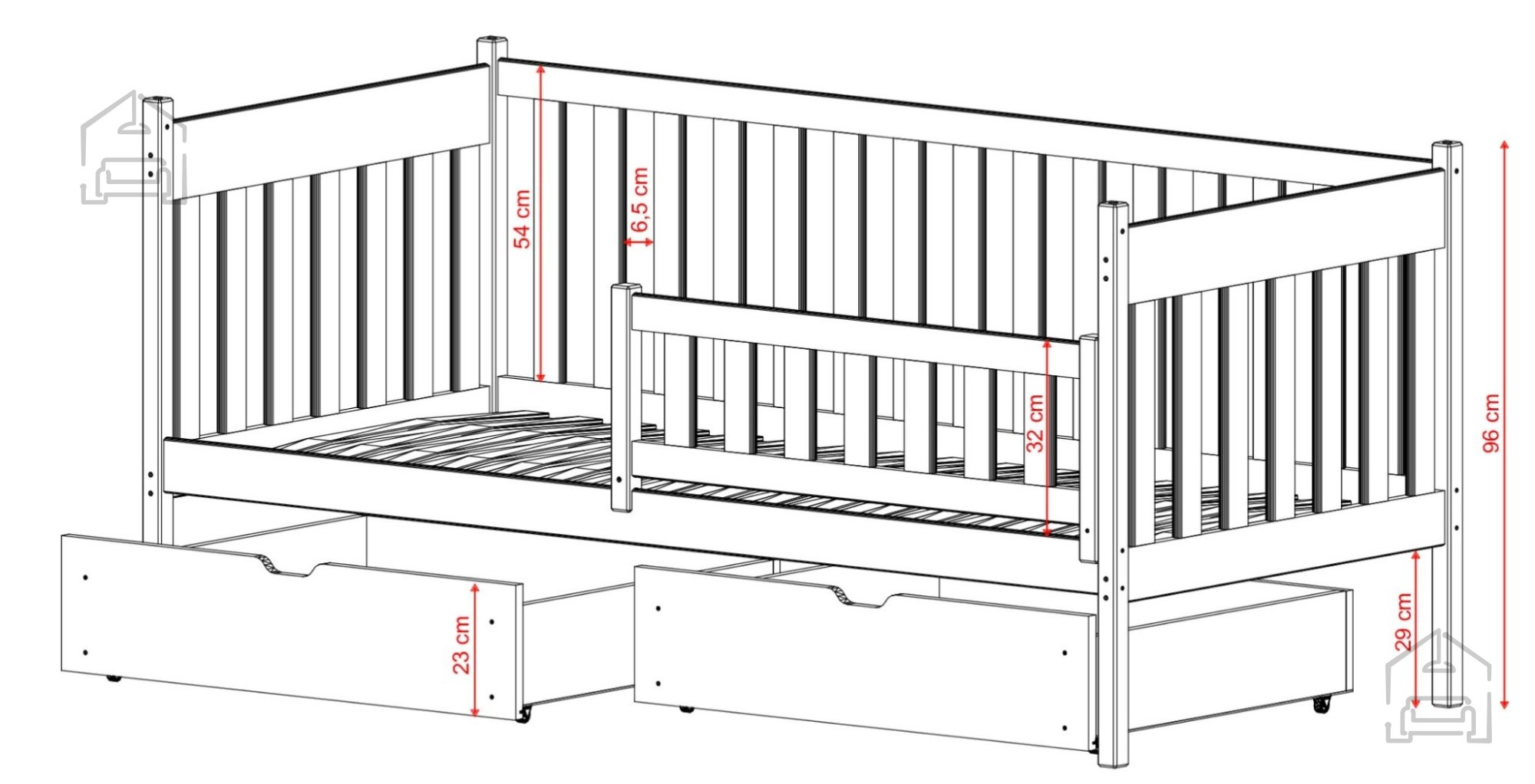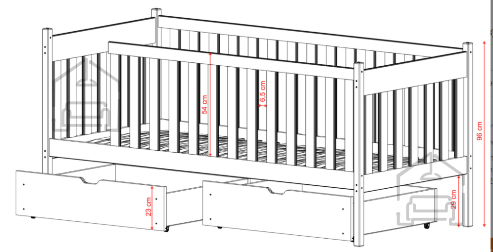 - Die Abmessungen des Bettes, 80x160 cm, bieten ausreichend Platz für einen bequemen Schlaf und Spiel des Kindes und ermöglichen die Anpassung des Kinderzimmers an die Bedürfnisse.