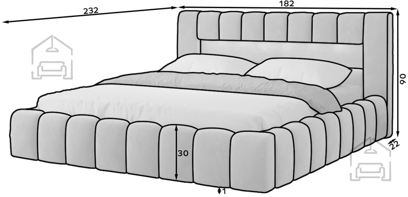 Lamica ist ein sehr bequemes, weiches und originelles Bett im Glamour-Stil, das mit seiner außergewöhnlichen Form und Gestaltung beeindruckt. Dieses Möbelstück besteht aus einem Korpus und einem Holzrahmen. Es verfügt auch über zwei geräumige Bettzeugfächer. Die Schlafoberfläche - wählbar in drei Versionen - 140/160/180x200 cm bietet ausreichend Platz für eine entspannte Erholung im Schlafzimmer unterschiedlicher Größe, das den eigenen Vorlieben und Möglichkeiten angepasst werden kann. Unser Bett zeichnet sich durch seine Verarbeitung aus, da das hohe Kopfteil und die Seiten des Bettes aus zusätzlichem Schaumstoff gefertigt sind.