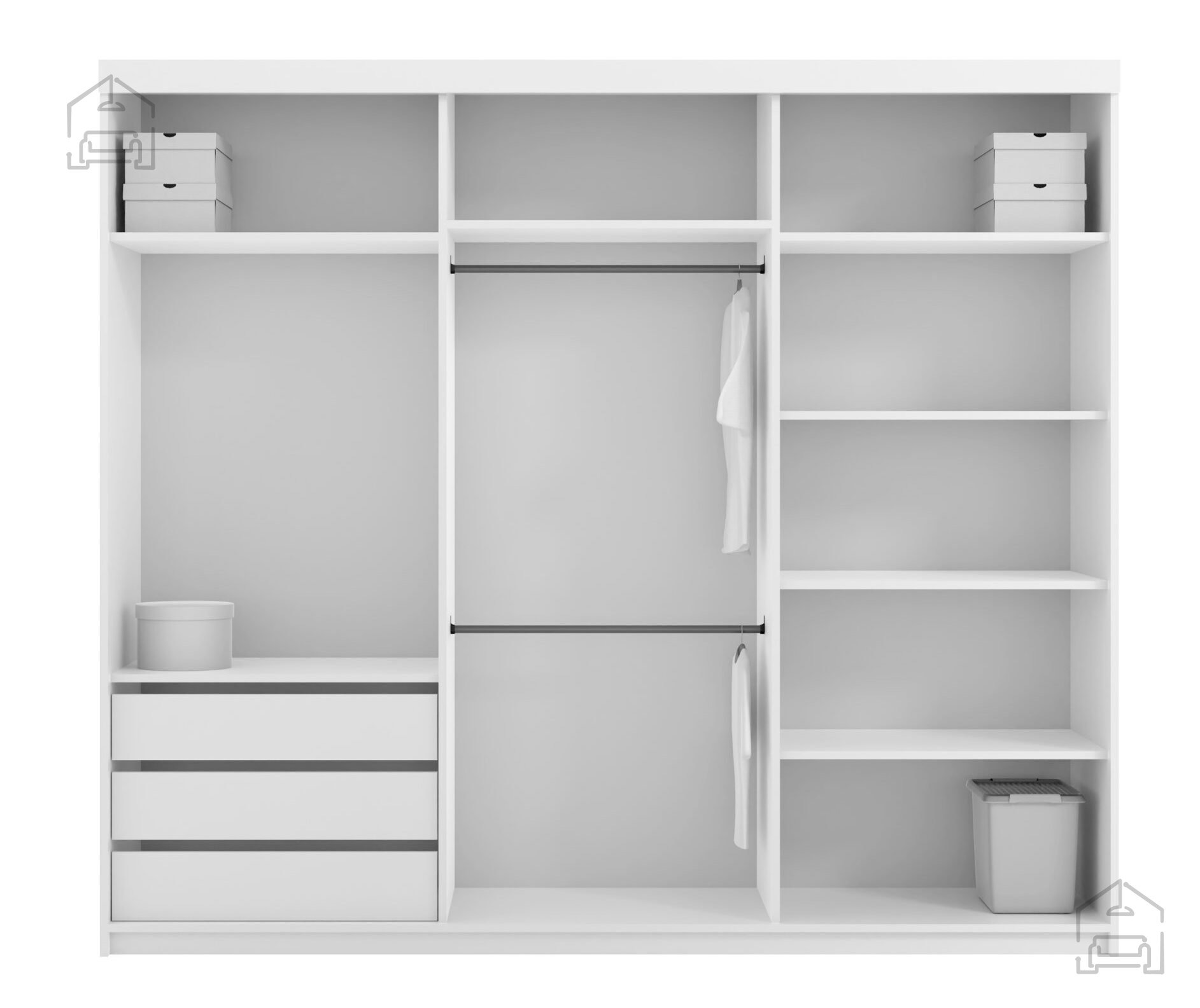 Das Innere des Kleiderschranks German 250 ist durchdacht gestaltet, um möglichst viel Stauraum zu bieten. Die Breite von 250 cm ermöglicht die Aufteilung der Kleidung in verschiedene Segmente. Im Inneren befinden sich in der Regel geräumige Regale für gefaltete Kleidung, Ablagen für Accessoires oder Schuhe sowie eine oder mehrere Kleiderstangen zum Aufhängen von Hemden, Kleidern oder Mänteln. Eine solche Aufteilung ermöglicht es, alles schnell und mühelos zu finden – von eleganten Kleidungsstücken bis hin zu Sportbekleidung.