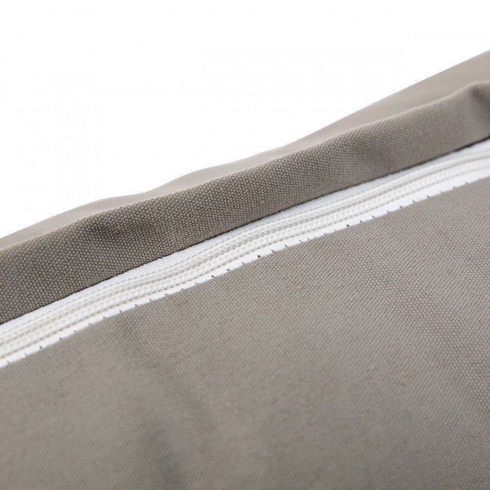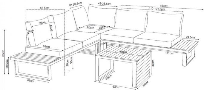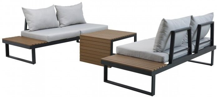 Der Rahmen der Garnitur besteht aus hochwertigem Aluminium, das pulverbeschichtet ist. Eine solche Oberflächenbehandlung sorgt nicht nur für Widerstandsfähigkeit gegen Rost und UV-Strahlung, sondern auch für ein elegantes mattes Aussehen, das über mehrere Saisons attraktiv bleibt. Die Oberfläche des Tisches und die Abschlüsse der Rückenlehnen bestehen aus Polywood – einem Kunststoffholz, das die Wärme der natürlichen Holzoptik mit der Beständigkeit gegen Feuchtigkeit und Sonne kombiniert. Die Kissen bestehen aus strapazierfähigem Stoff aus recyceltem Polyester (230 g/m²), der angenehm im Griff, atmungsaktiv und gleichzeitig farbbeständig ist.