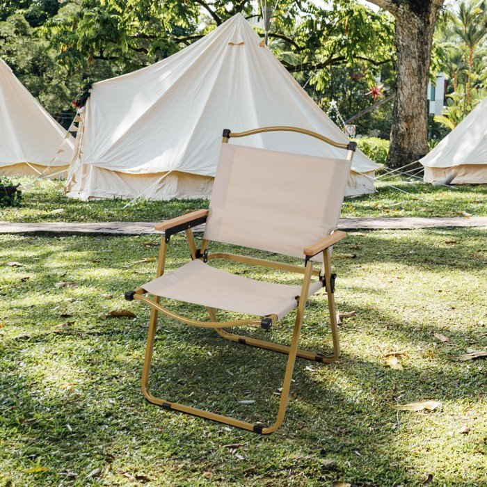 Dieser klappbare Campingstuhl vereint robuste Konstruktion, einfache Tragbarkeit und Komfort, den Sie beim Aufenthalt im Freien unbedingt benötigen. Mit einer Höhe von 78 cm, einer Breite von 54 cm und einer Tiefe von 62 cm bietet er optimale Körperunterstützung, egal ob Sie ihn beim Campen, Picknick oder im heimischen Garten verwenden. Das Gestell besteht aus hochwertigem Stahl, was Stabilität und lange Lebensdauer gewährleistet, während der Sitz aus dicht gewebtem 600D Polyester besteht, bekannt für seine Beständigkeit gegen Abnutzung, Feuchtigkeit und UV-Strahlen. In beiger Farbe passt der Stuhl perfekt sowohl in natürliche als auch in urbane Umgebungen und schafft ein Gefühl von Wärme und Entspannung.