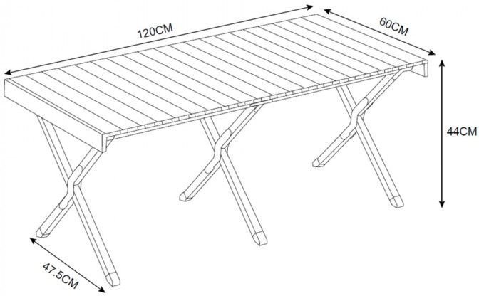 Aluminiumkonstruktion und Klappmechanismus: Campingtisch Baum 120 cm – Mirpol. Dieser praktische und leichte Tisch ist für alle Naturliebhaber konzipiert, die auf Reisen, beim Camping oder Picknick den Komfort genießen möchten, den normalerweise das heimische Esszimmer bietet. Er ist aus hochwertigem Aluminium gefertigt, das Festigkeit, Korrosionsbeständigkeit und ein äußerst geringes Gewicht gewährleistet, sodass Sie ihn problemlos überallhin mitnehmen können. Mit einer Breite von 120 cm, einer Tiefe von 60 cm und einer Höhe von 44 cm bietet er ausreichend Platz zum Servieren von Speisen, für Gesellschaftsspiele oder für entspanntes Sitzen bei einer Tasse Kaffee in der Natur. Sein klappbares Design ermöglicht schnelles Aufstellen und Zusammenlegen, wodurch er die perfekte Lösung für jede Freizeitaktivität im Freien ist.