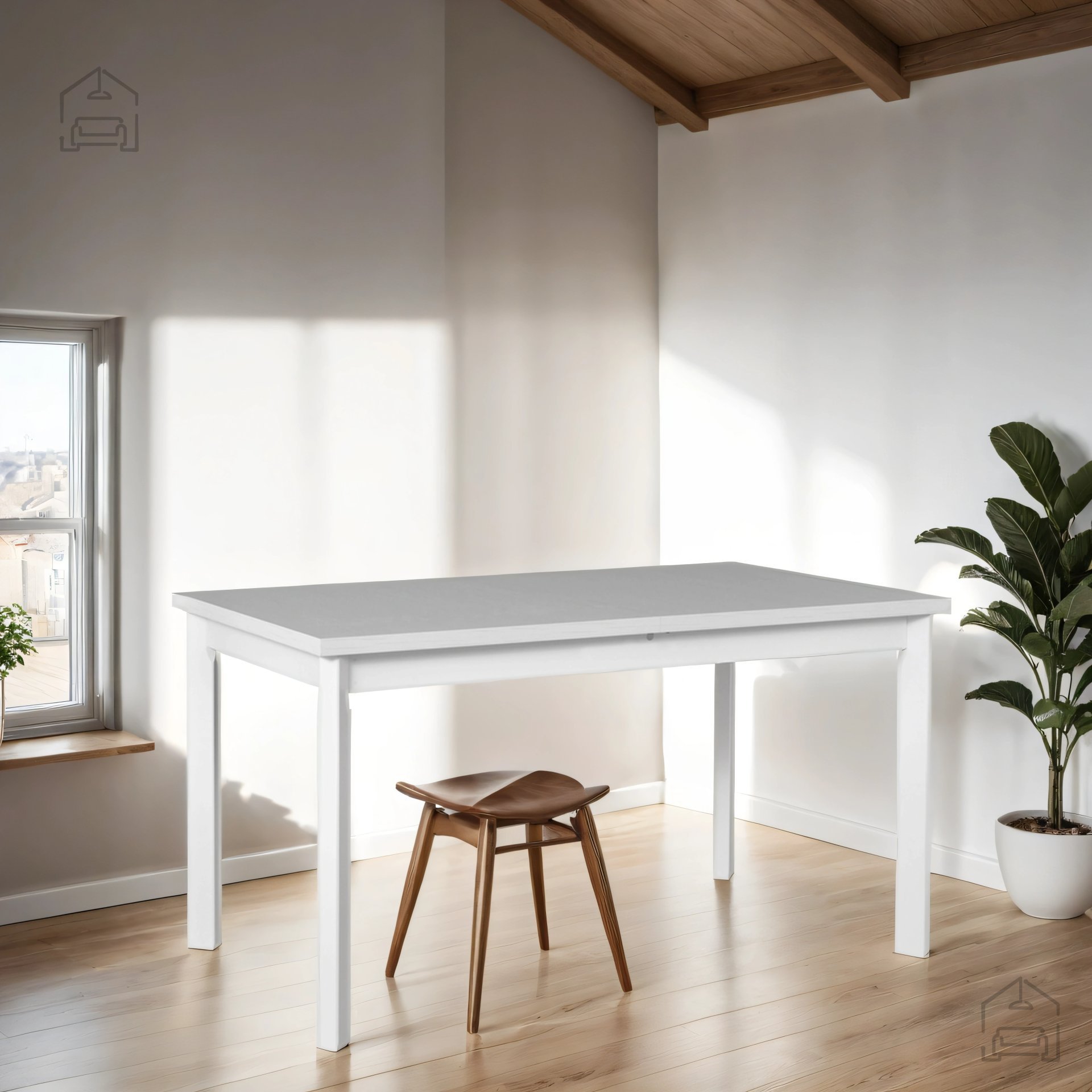 Der weiße Tisch passt hervorragend zu verschiedenen Stuhlfarben – von sanften Pastelltönen bis zu kontrastreichem Schwarz oder Holztönen. Für ein harmonisches Erscheinungsbild kann er mit anderen Möbelstücken aus Buchenholz oder modernen Metallelementen kombiniert werden. In minimalistischen Räumen wirkt er als visuelles Zentrum, das den Raum zu einer Einheit verbindet, während er in klassisch eingerichteten Esszimmern Frische und Helligkeit verleiht.