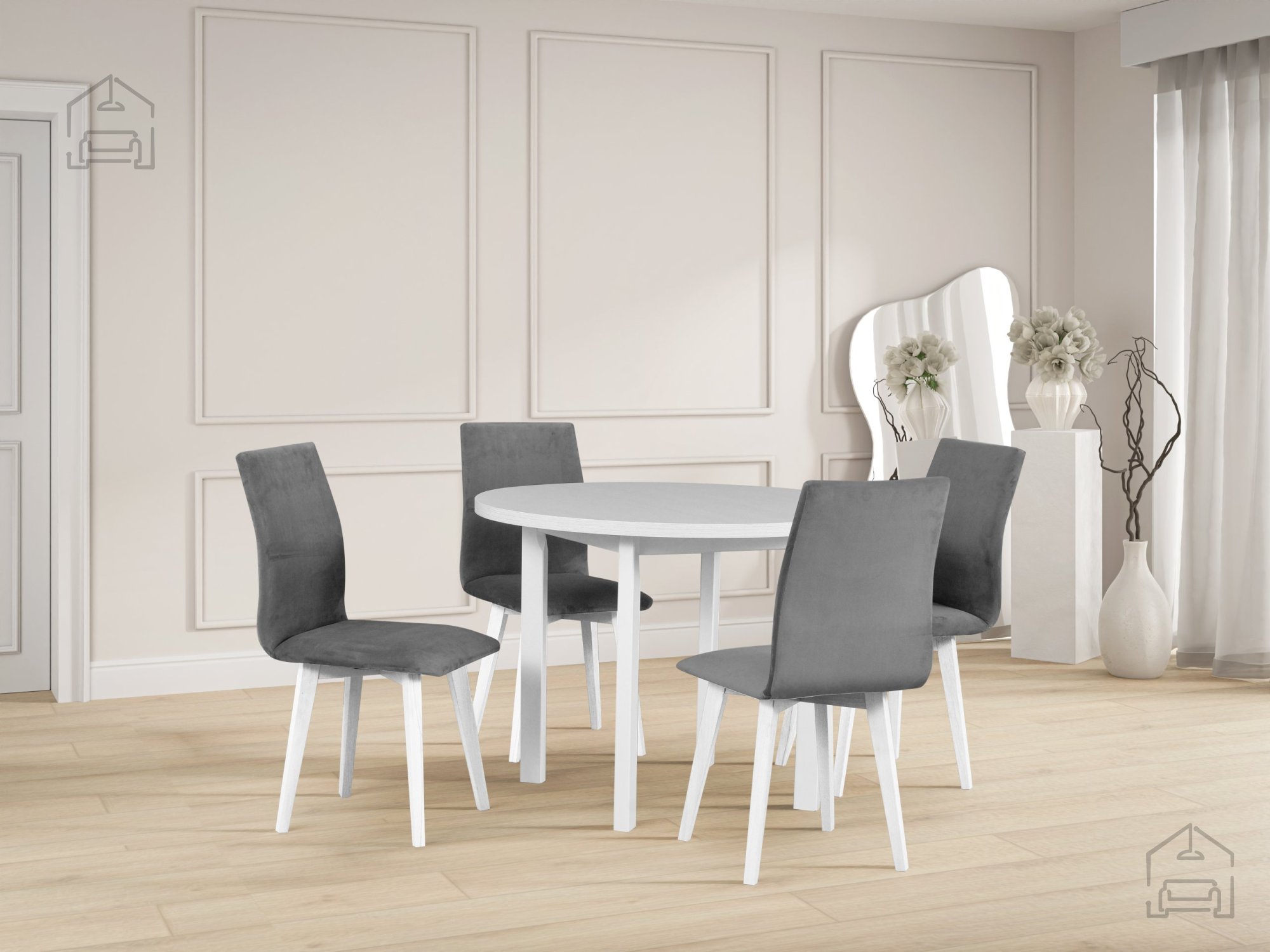 Der Esstisch Poli 2 – Drewmix stellt ein hervorragendes Gleichgewicht zwischen Ästhetik, Funktionalität und Verarbeitungsqualität dar. Der massive Buchenrahmen und die laminierte Oberfläche gewährleisten Stabilität und einfache Pflege, während die weiße Farbe Ihrem Zuhause ein Gefühl von Reinheit und Helligkeit verleiht. Unabhängig davon, ob Sie ihn in einer modernen Küche oder einem traditionellen Esszimmer platzieren, wird dieser Tisch zum zentralen Ort der Begegnung, Wärme und guter Gespräche.