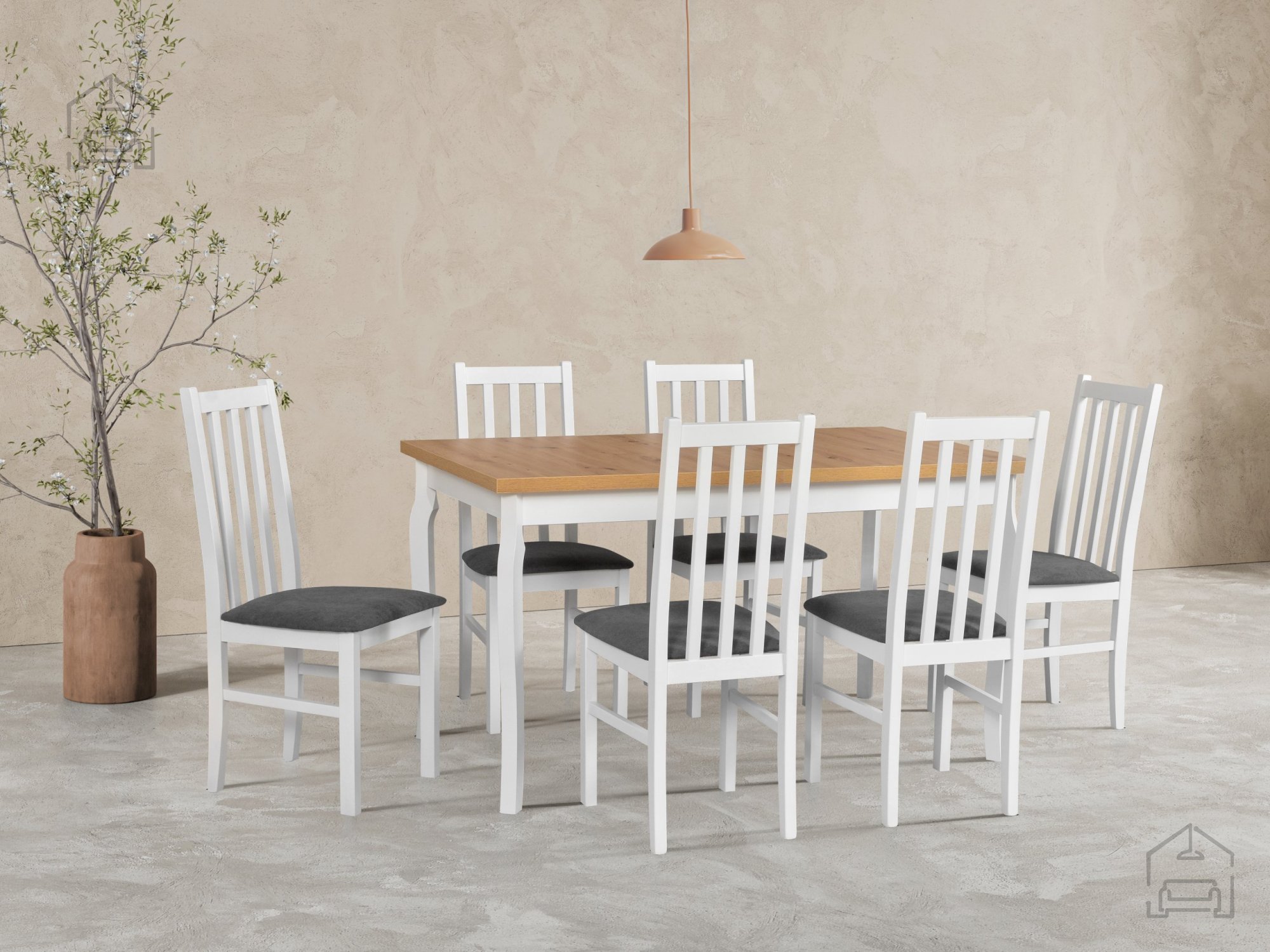Die Basis aus massivem Buchenholz verleiht dem Tisch außergewöhnliche Stabilität und natürliche Wärme. Buche ist bekannt für ihre Härte, Schlagfestigkeit und gleichmäßige Struktur, die Drewmix zusätzlich mit hochwertigem Lack schützt. Die laminierte Tischplatte ist kratz- und fleckenbeständig, was bedeutet, dass sie ihr Aussehen auch nach Jahren des täglichen Gebrauchs beibehält. Die Kombination aus weißer Oberfläche und Artisan-Dekor imitiert die natürliche Textur von Eiche, wodurch der Tisch Alba 5 gleichzeitig modern und wohnlich wirkt. Diese Doppelnatur ermöglicht es, ihn harmonisch mit zahlreichen Einrichtungsstilen zu kombinieren – vom skandinavischen Minimalismus bis zu rustikalen Umgebungen.