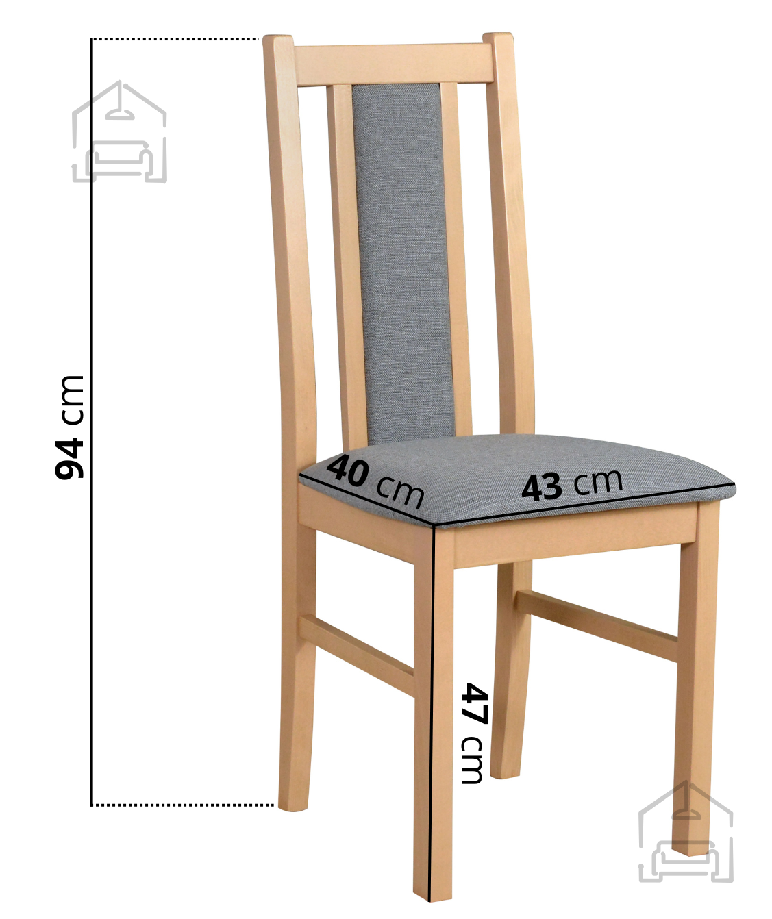 Mit den Abmessungen Breite 43 cm, Tiefe 40 cm und Höhe 94 cm bietet der Stuhl Bos 14 optimale ergonomische Rückenunterstützung und Komfort bei jeder Mahlzeit. Sitzhöhe 47 cm ist ideal für Standard-Esstische und ermöglicht entspanntes Sitzen ohne Engegefühl. Der stabile Rahmen aus Massivholz ist zusätzlich verstärkt, was eine lange Lebensdauer und Stabilität auch nach Jahren der Nutzung garantiert.