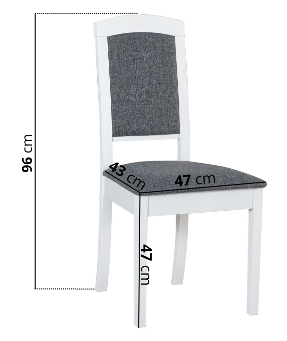 Die Abmessungen des Stuhls – Breite 47 cm, Tiefe 43 cm und Höhe 96 cm – sind perfekt ausbalanciert für bequemes Sitzen. Die Sitzhöhe von 47 cm entspricht den Standardhöhen von Esstischen, was bedeutet, dass sich der Stuhl Roma 14 leicht mit den meisten Tischen in Ihrer Küche oder Ihrem Esszimmer kombinieren lässt. Die Form der Rückenlehne ist leicht abgerundet, was eine natürliche Unterstützung der Wirbelsäule ermöglicht und Ermüdung bei längerem Sitzen reduziert. Der Sitz ist weich gepolstert, aber dennoch fest genug, um seine Form auch nach Jahren des Gebrauchs zu behalten.