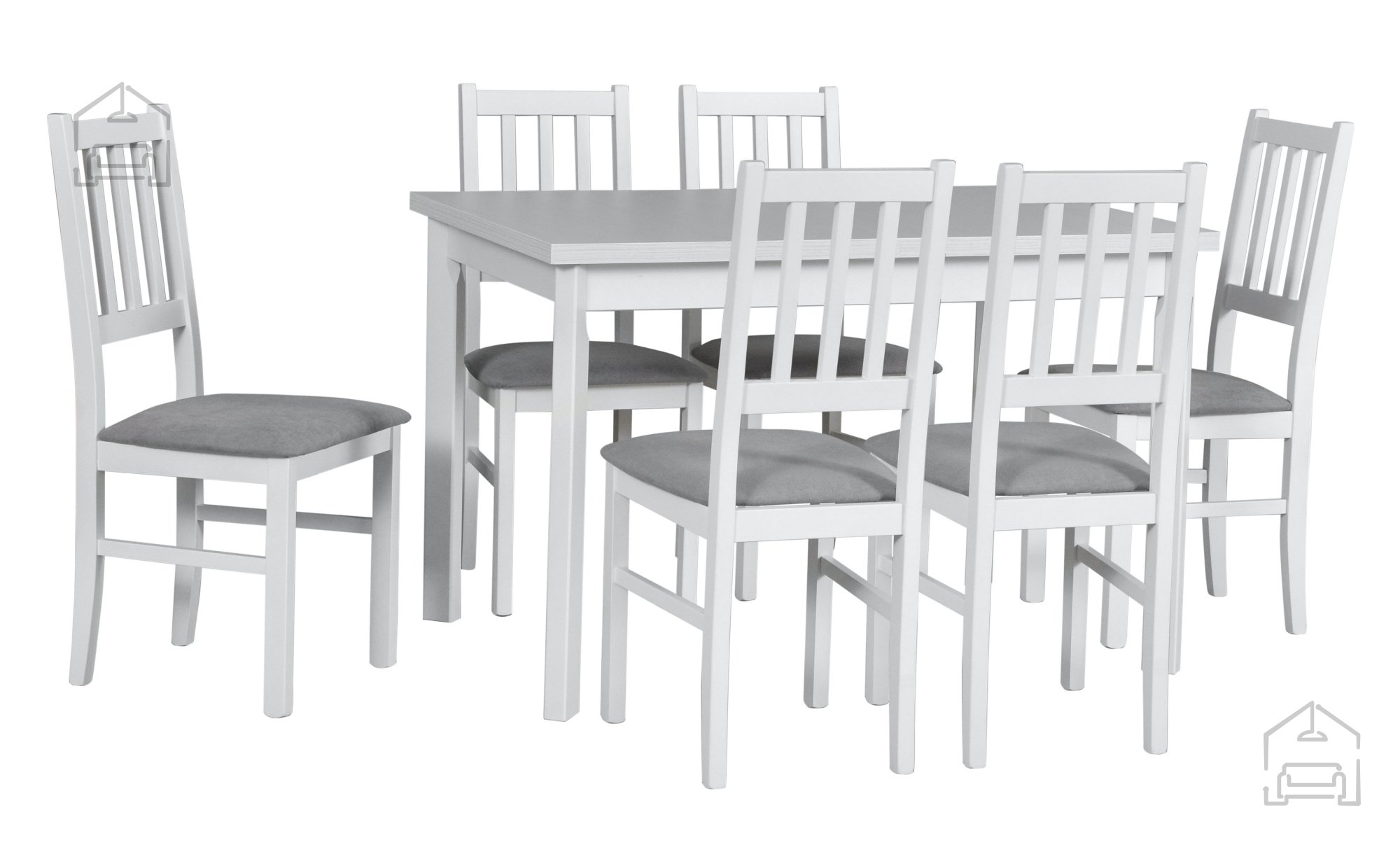 Im Set sind sechs Stühle Bos 4 Weiß 1B enthalten, die mit ihrem eleganten Design das Erscheinungsbild des Tisches ergänzen. Jeder Stuhl misst 40 × 43 × 94 cm, was ergonomisches Sitzen und eine angemessene Rückenunterstützung gewährleistet. Der Rahmen der Stühle ist ebenfalls aus massivem Buchenholz gefertigt, was Stabilität und Festigkeit erhöht. Sitz und Rückenlehne sind so gestaltet, dass sie auch bei längeren Mahlzeiten oder Treffen mit Freunden bequemes Sitzen ermöglichen. Die Stühle sind leicht, aber äußerst robust, was einfaches Bewegen und eine lange Lebensdauer ermöglicht.