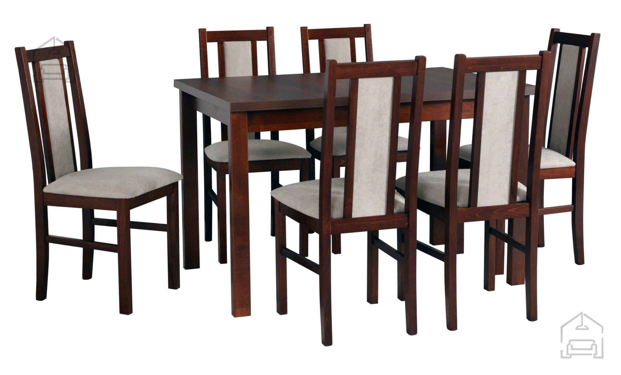 Ausziehbarer Tisch 80×120–150×76 cm und massives Buchenholz: Esszimmer-Set Tisch Alba 2 Nuss + 6 Stühle Bos 14 Nuss 3B – Drewmix.