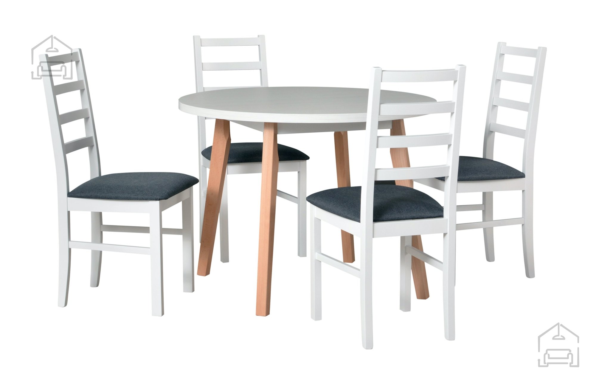 Dieses Set ist eine ausgezeichnete Wahl für alle, die eine einfache, aber elegante Lösung für ein modernes Esszimmer suchen. Aufgrund seiner universellen Farbkombination passt es sowohl in helle skandinavische Interieurs als auch in klassisch eingerichtete Räume. In kleineren Wohnungen wirkt es luftig und geräumig, da die weiße Farbe den Raum optisch vergrößert, während es in größeren durch die natürliche Holzstruktur ein Gefühl von Wärme und Gemütlichkeit schafft.