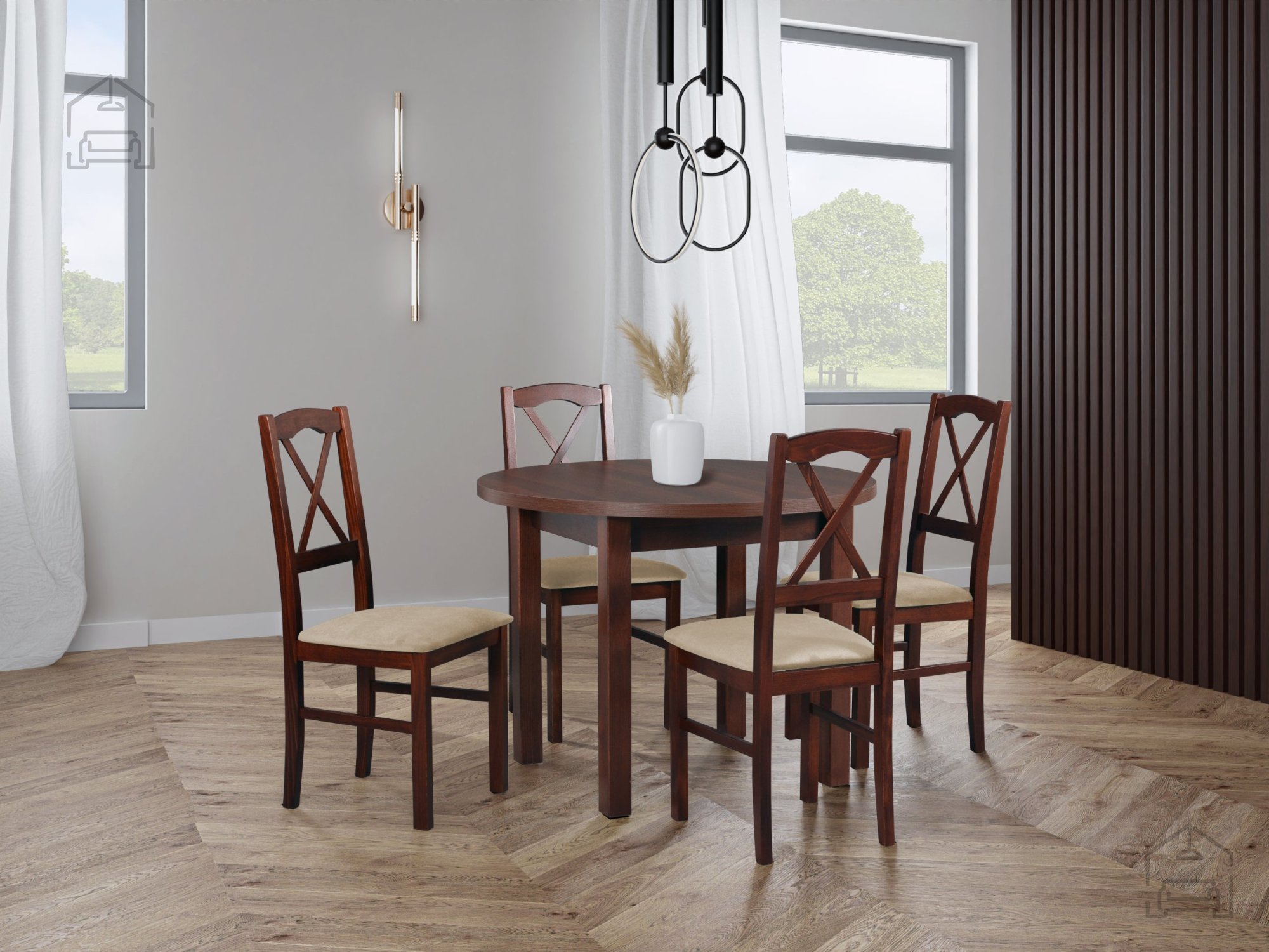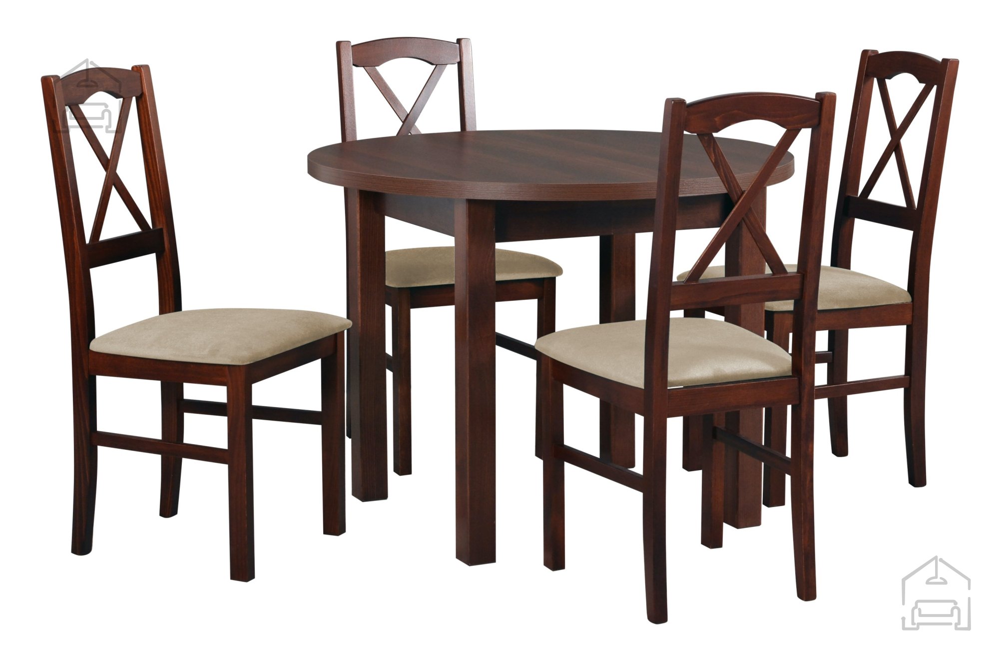 Das Esszimmer-Set Poli 4 mit einem Tisch und vier Stühlen Nilo 11 in der Farbe Nussbaum 27B ist die perfekte Lösung für alle, die ein gemütliches, wohnliches und zugleich elegantes Esszimmer schaffen möchten. Das Produkt des polnischen Herstellers Drewmix vereint hochwertige Verarbeitung, Funktionalität und ästhetische Vollkommenheit. Massives Buchenholz und eine laminierte Tischplatte sorgen für Langlebigkeit, Stabilität und einfache Pflege, während der reiche Nussbaumton dem Raum Wärme und ein Gefühl natürlicher Eleganz verleiht.