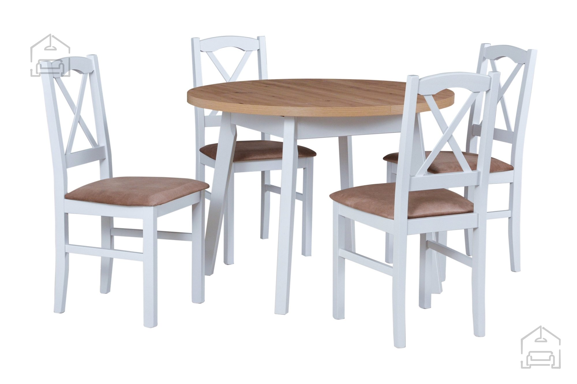 Ausziehbarer Tisch 100–130 cm und massives Buchenholz: Esszimmer-Set Oslo 3 L weiß/Artisan + 4 Stühle Nilo 11 weiß 21B – Drewmix.