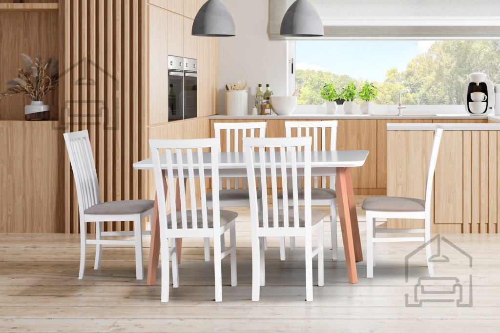 Das Esszimmer-Set Wenus 2 S mit ausziehbarem Tisch und sechs eleganten Stühlen Milano 1 bringt in Ihr Zuhause ein perfektes Gleichgewicht zwischen der Wärme des natürlichen Holzes und einer modernen, hellen Ästhetik. Der Tisch aus hochwertigem massivem Buchenholz mit einer laminierten Platte in einer Kombination aus Weiß und Eichenfarbe schafft einen angenehmen Mittelpunkt des Raumes, während die Stühle mit der weißen Oberfläche 30B das Erscheinungsbild mit Frische und Reinheit ergänzen. Sowohl Tisch als auch Stühle sind mit Schwerpunkt auf Stabilität, Komfort und zeitlosem Aussehen entworfen, das sich harmonisch mit verschiedenen Einrichtungsstilen – von klassisch bis modernem Minimalismus – verbindet.