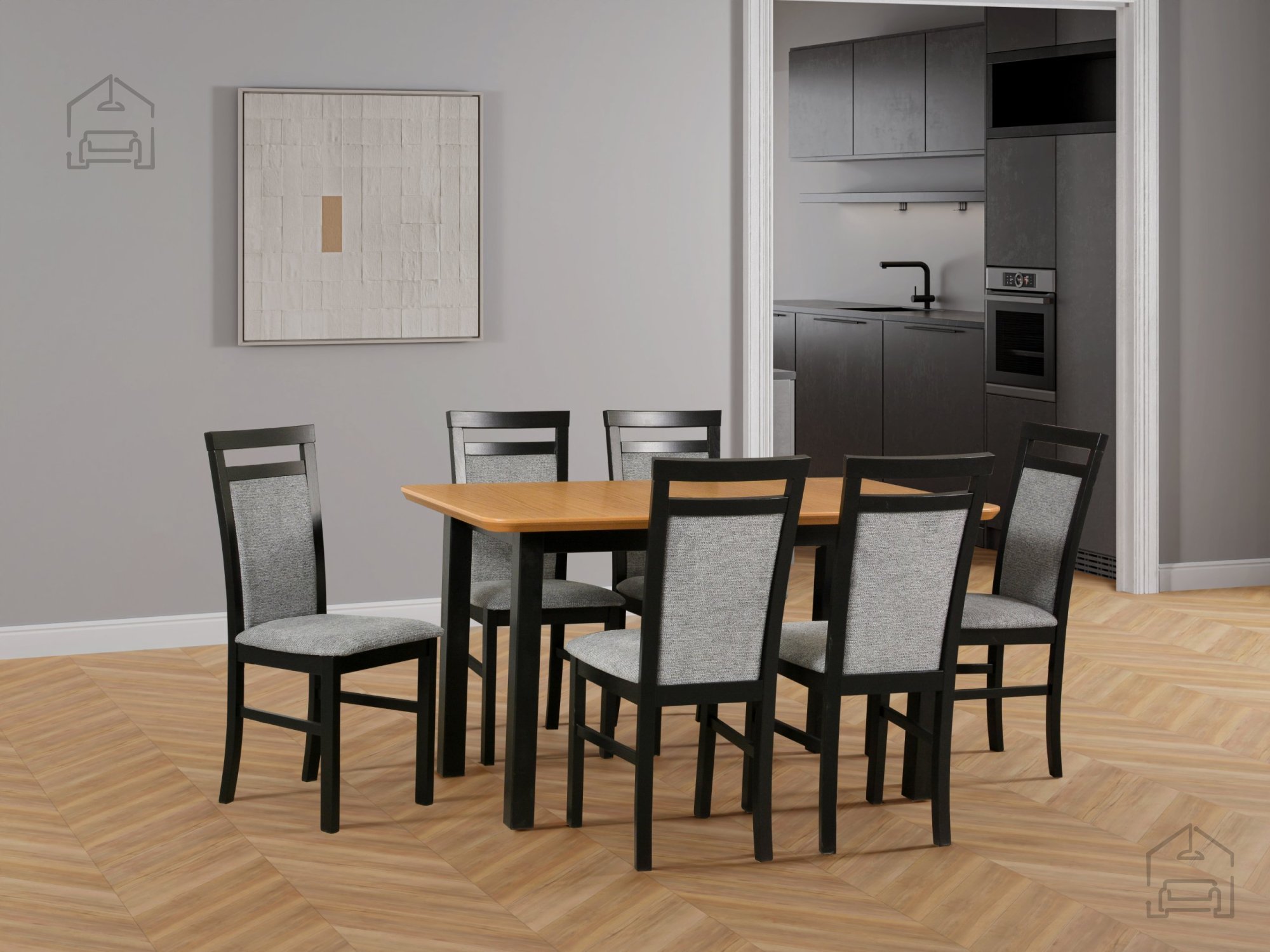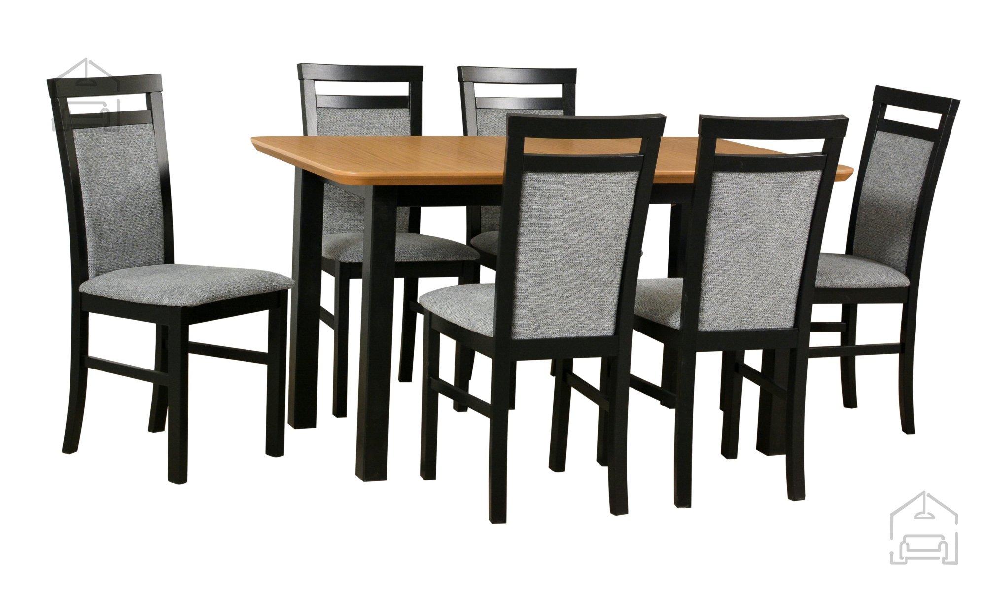 Ausziehbare Konstruktion 140–180 cm: Esszimmer-Set Wenus 2S schwarz/Eiche + 6 Stühle Milano 5 schwarz 37A aragon 93 – Drewmix.