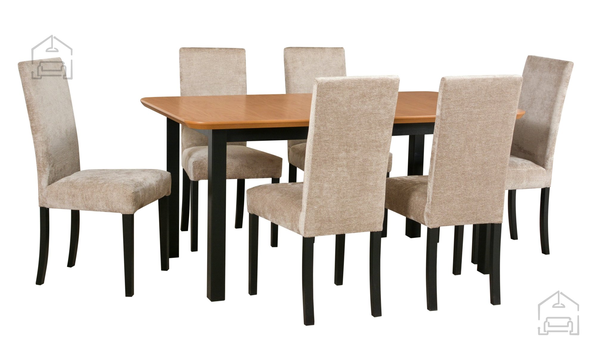 Ausziehbarer Tisch 160–220 × 90 cm mit massivem Buchenrahmen und laminierter Platte: Esszimmer-Set Wenus 5 S + 6 Stühle Roma 2 – Drewmix.