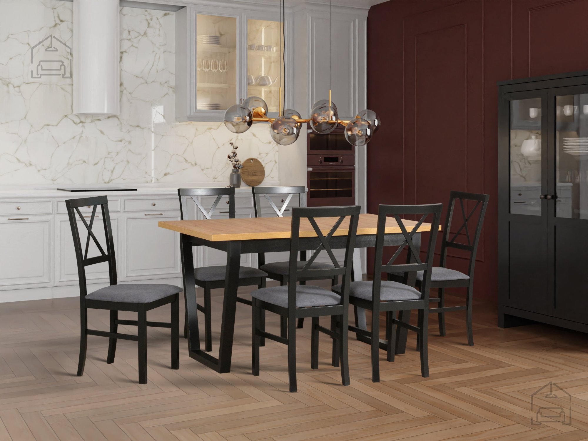 Das Esszimmer-Set Ikon 2 Schwarz/Wotan + 6 Stühle Milano 4 Schwarz 28B – Drewmix wird mit seiner Kombination aus massivem Holz, durchdachter Ergonomie und modernem Farbschema zum Mittelpunkt Ihres Esszimmers, wo angenehme Gespräche, Familienessen und entspannte Abende mit Freunden stattfinden werden. Es handelt sich um Möbel, die nicht nur durch ihr Aussehen, sondern auch durch ihre Haltbarkeit und Verarbeitungsqualität überzeugen.
