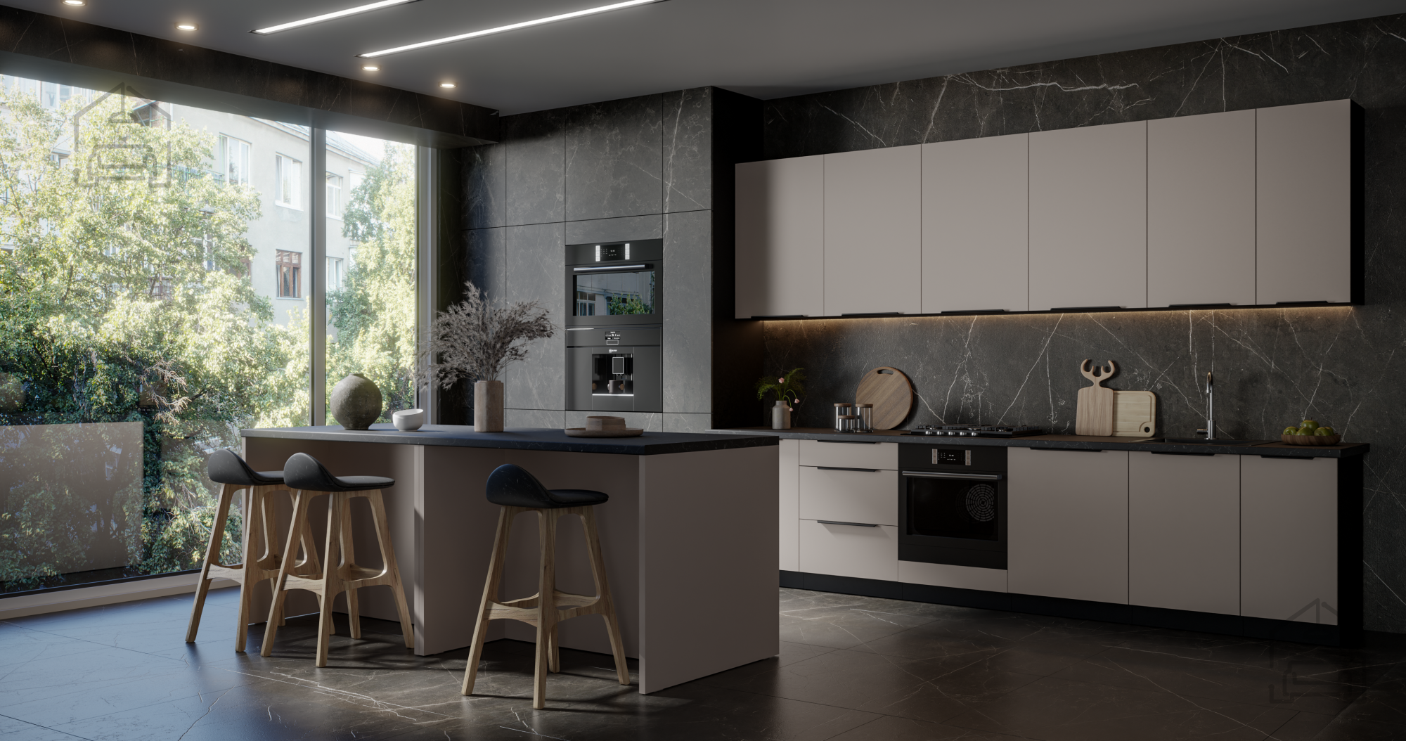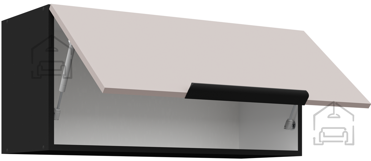 Material: Laminierte Platte 16 mm Farbe: Kaschmir/Schwarz Griff: Kantengriff UA-HEXA, Schwarz/Aluminium Arbeitsplatte: 38-6499 Marmor Roma System für leises Schließen von Fronten und Schubladen