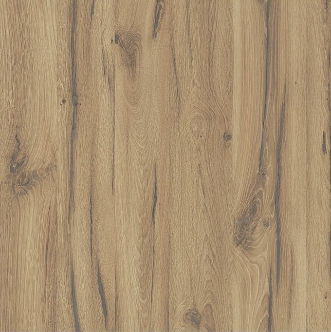 Der Kern der Arbeitsplatte besteht aus einer strapazierfähigen Spanplatte (Iveral), die Stabilität und eine lange Lebensdauer gewährleistet. Die Oberfläche ist mit einem hochwertigen Laminat überzogen, das feuchtigkeits-, kratz- und temperaturbeständig ist – Eigenschaften, die in einer modernen Küche von entscheidender Bedeutung sind. Die Kanten sind präzise mit PVC-Furnier bearbeitet, was die Platte zusätzlich vor möglichem Feuchtigkeitseintritt schützt und die Beständigkeit gegen mechanische Beschädigungen erhöht. Darüber hinaus ist der Kantenschutz ästhetisch vollendet, da er farblich mit dem Dekor des hellen Eichenholzes harmoniert und der Arbeitsplatte ein einheitliches, natürliches Aussehen verleiht.