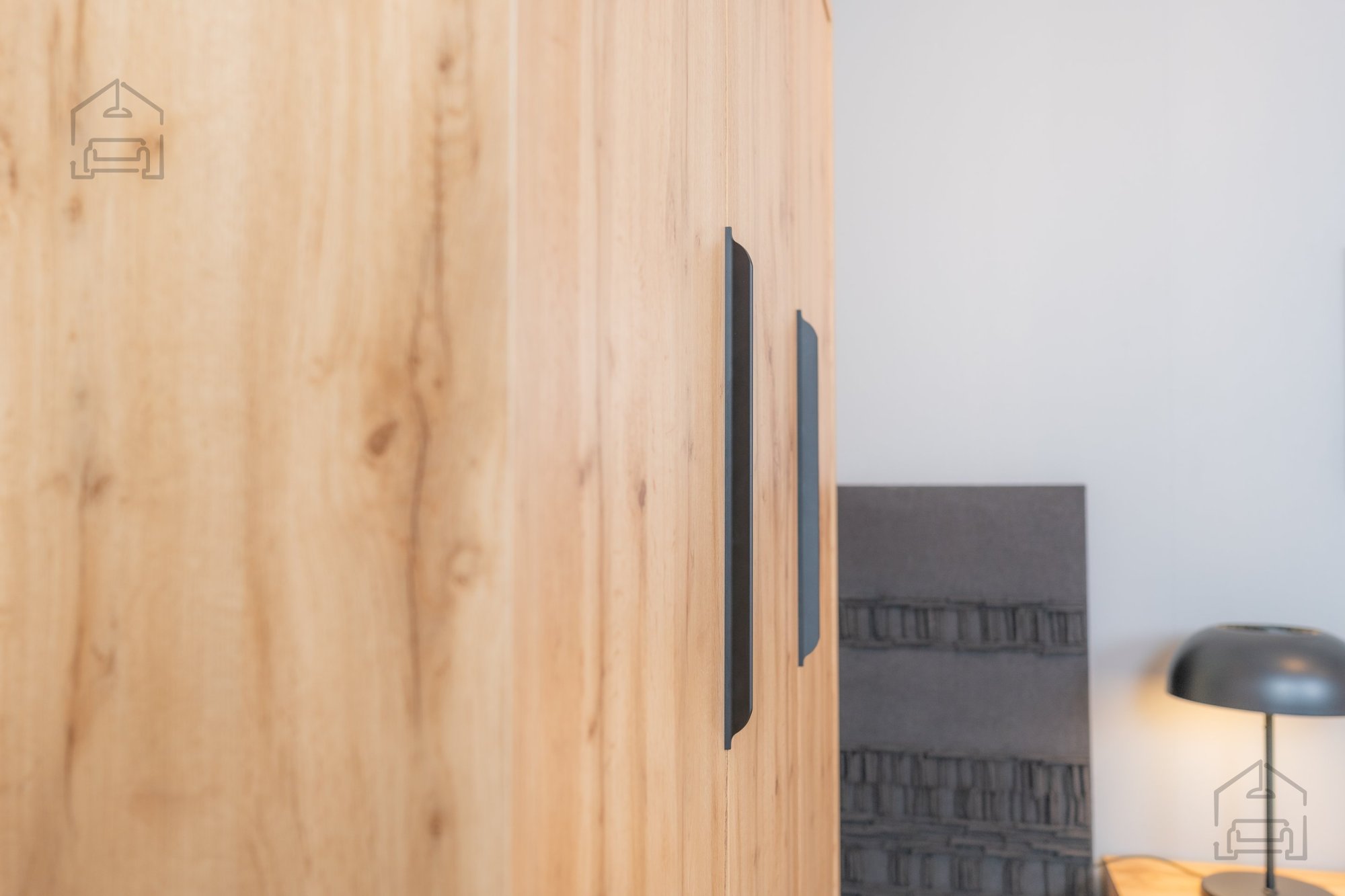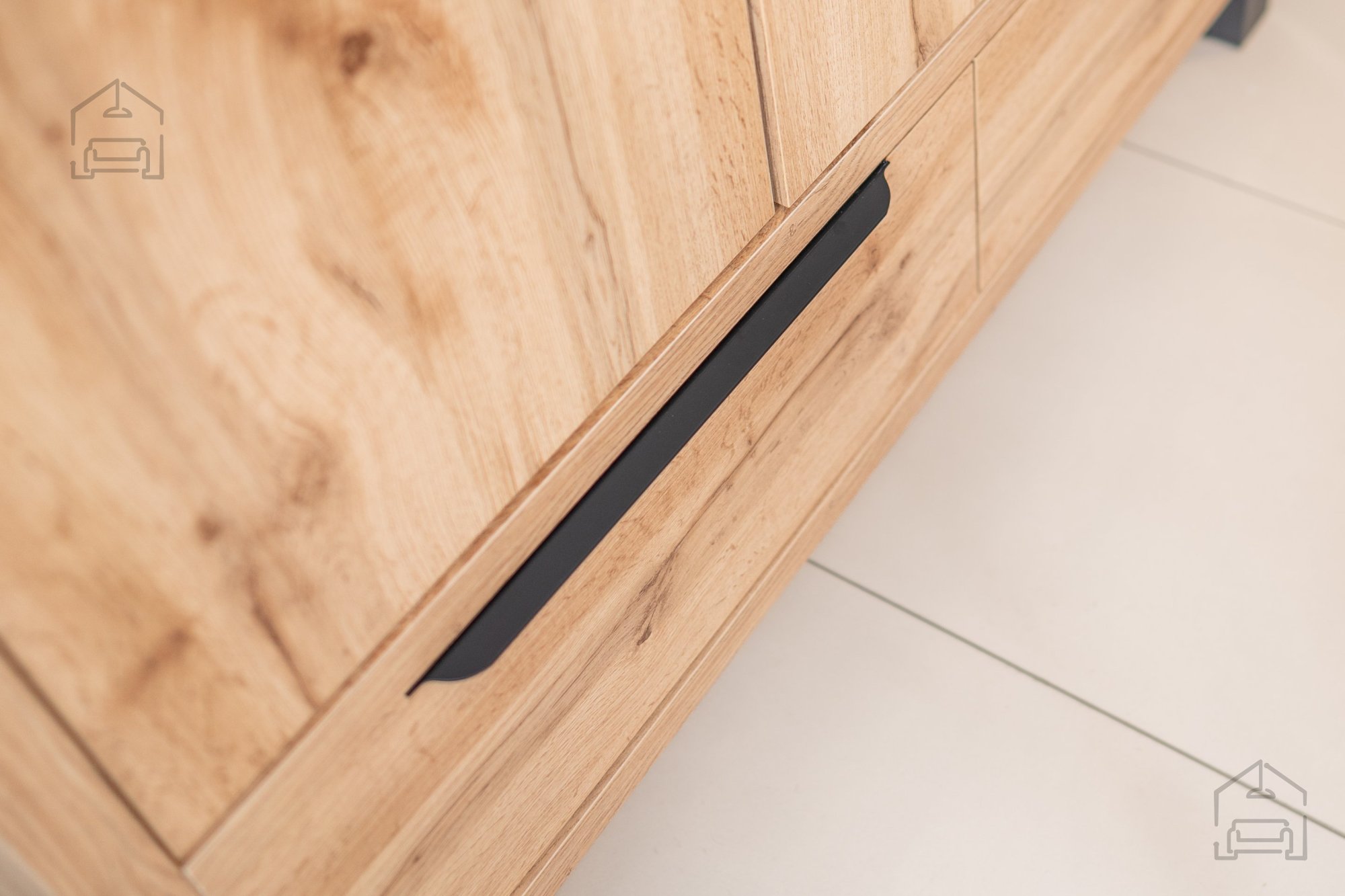 Die Details machen den Unterschied. Der Kleiderschrank Halle S ist mit schwarzen Metallgriffen ausgestattet, die einen angenehmen Halt und ein modernes Erscheinungsbild gewährleisten. Schwarze Metallfüße sorgen für Stabilität und heben den Schrank gleichzeitig vom Boden ab, was eine einfache Reinigung und Pflege des Bereichs unter dem Schrank ermöglicht.