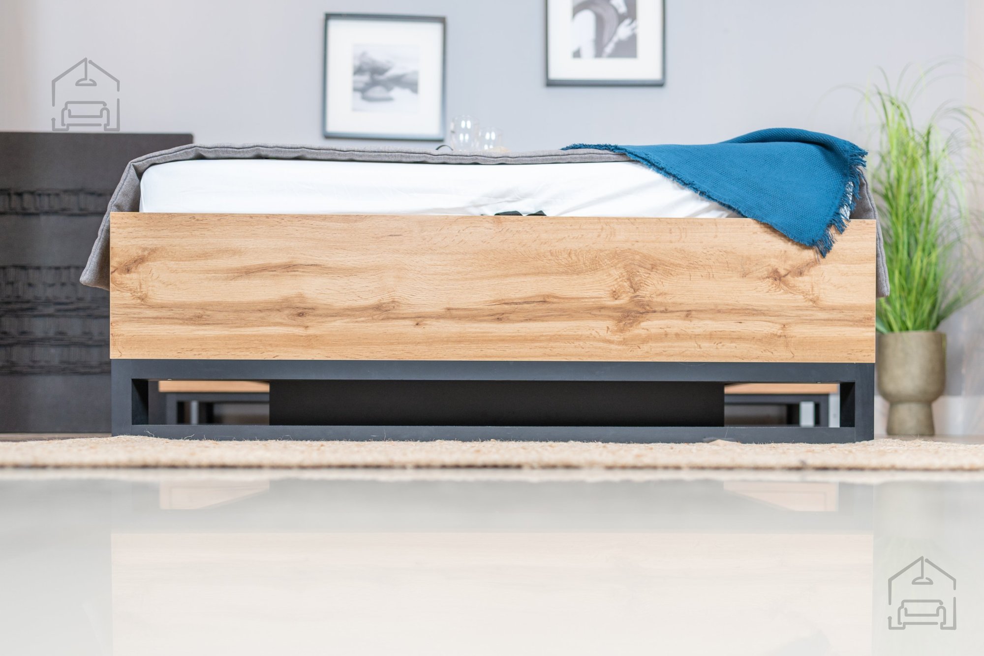 Die Beine des Bettes sind aus robustem Metall gefertigt und schwarz lackiert, was Stabilität und Langlebigkeit garantiert. Diese Kombination sorgt dafür, dass das Bett Halle S nicht nur ästhetisch ansprechend, sondern auch funktional und sicher in der Anwendung ist.