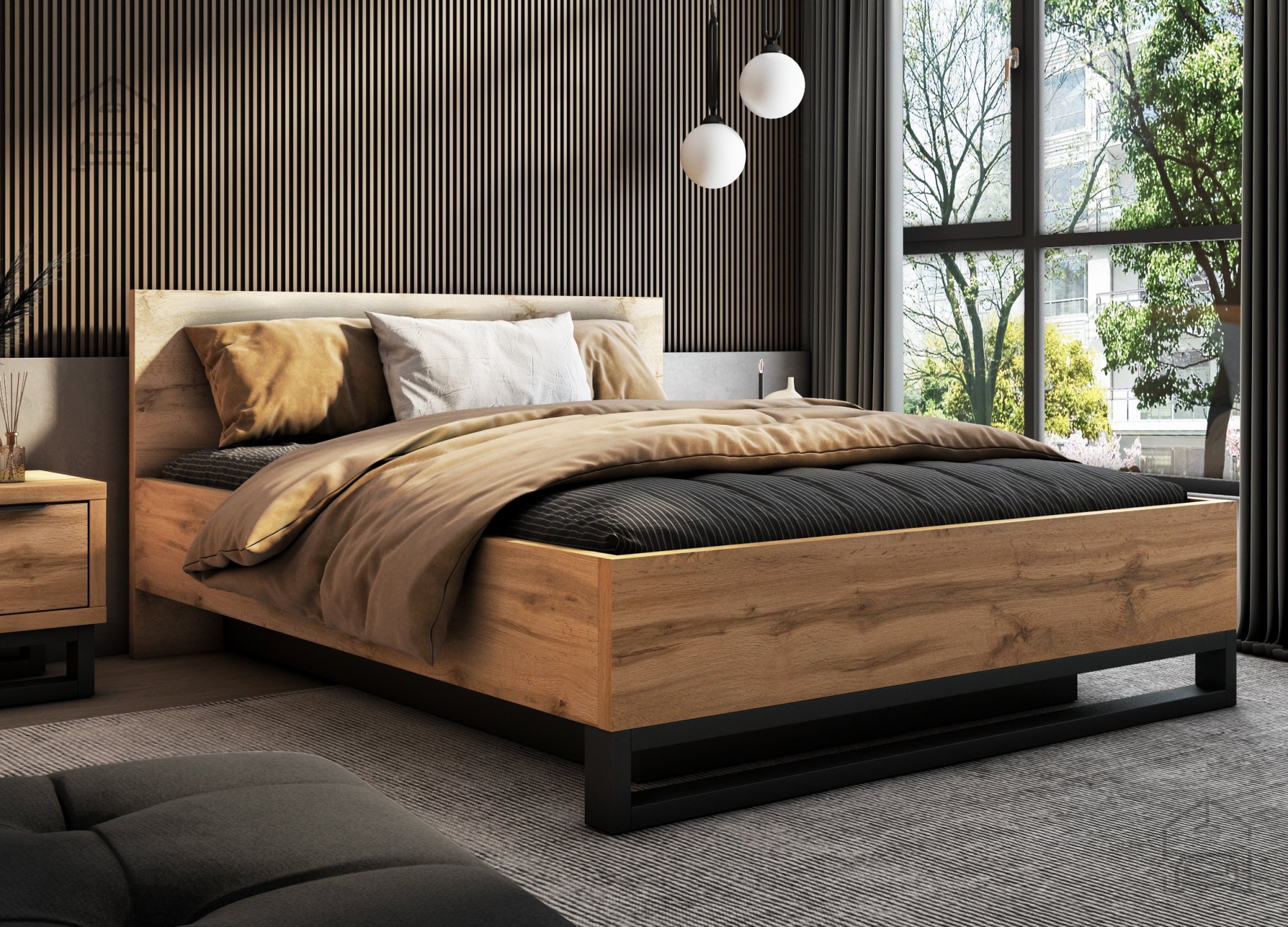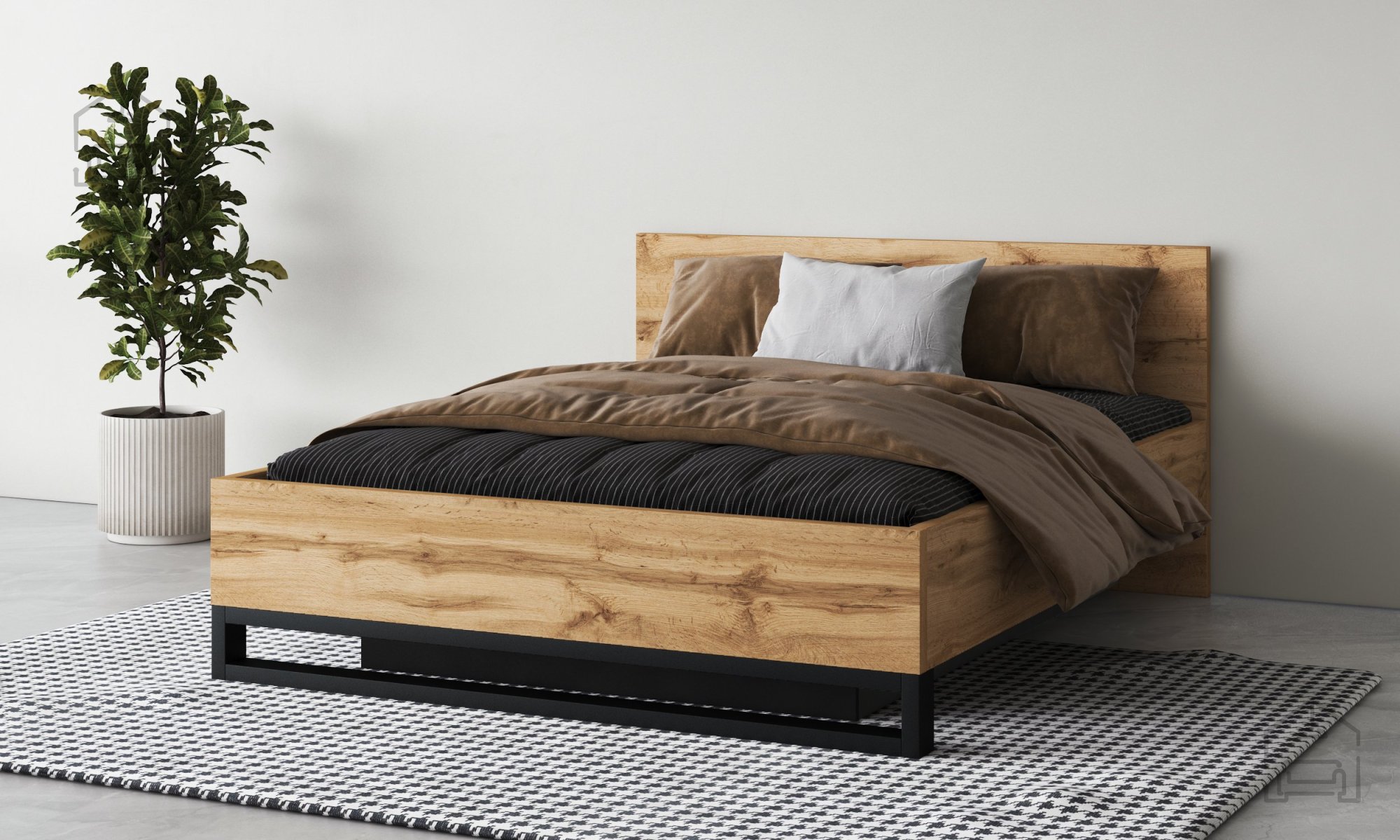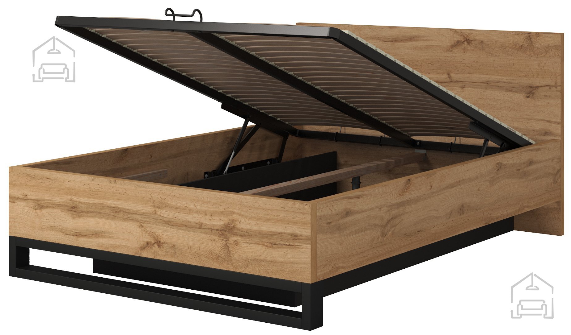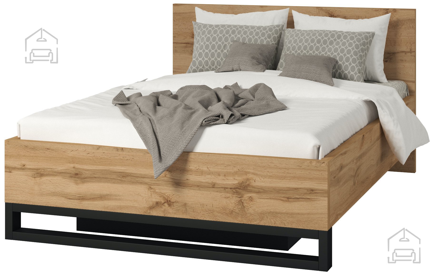 Das Bett ist aus hochwertiger laminierter Platte gefertigt, was eine lange Lebensdauer und einfache Pflege garantiert. Seine Farbe, Eiche Wotan in Kombination mit schwarzen Details, bringt Wärme und ein modernes Aussehen, das sich problemlos mit verschiedenen Einrichtungsstilen kombinieren lässt. Die Vielseitigkeit dieser Farbkombination ermöglicht eine einfache Abstimmung mit anderen Möbelstücken in Ihrem Zuhause.
