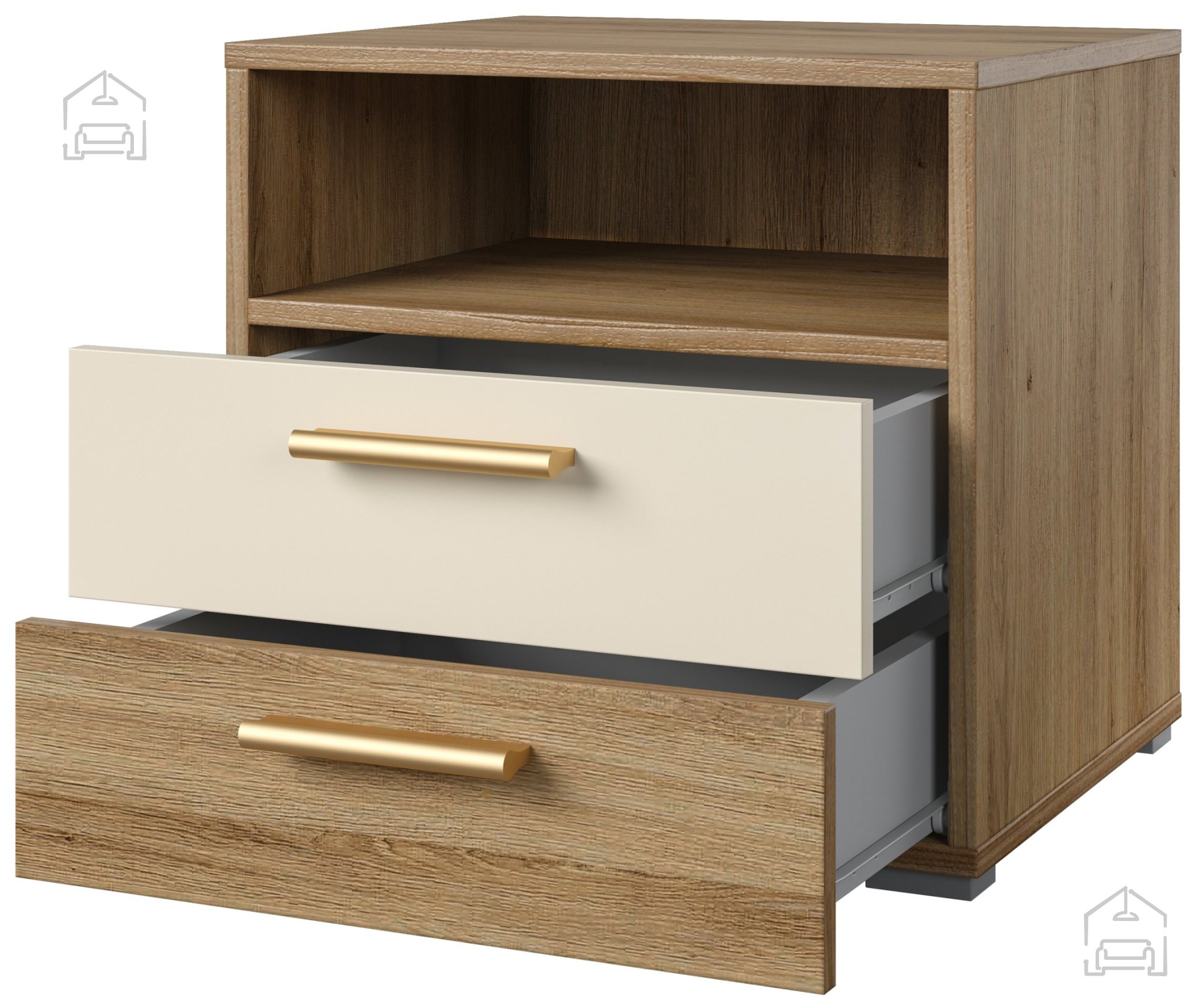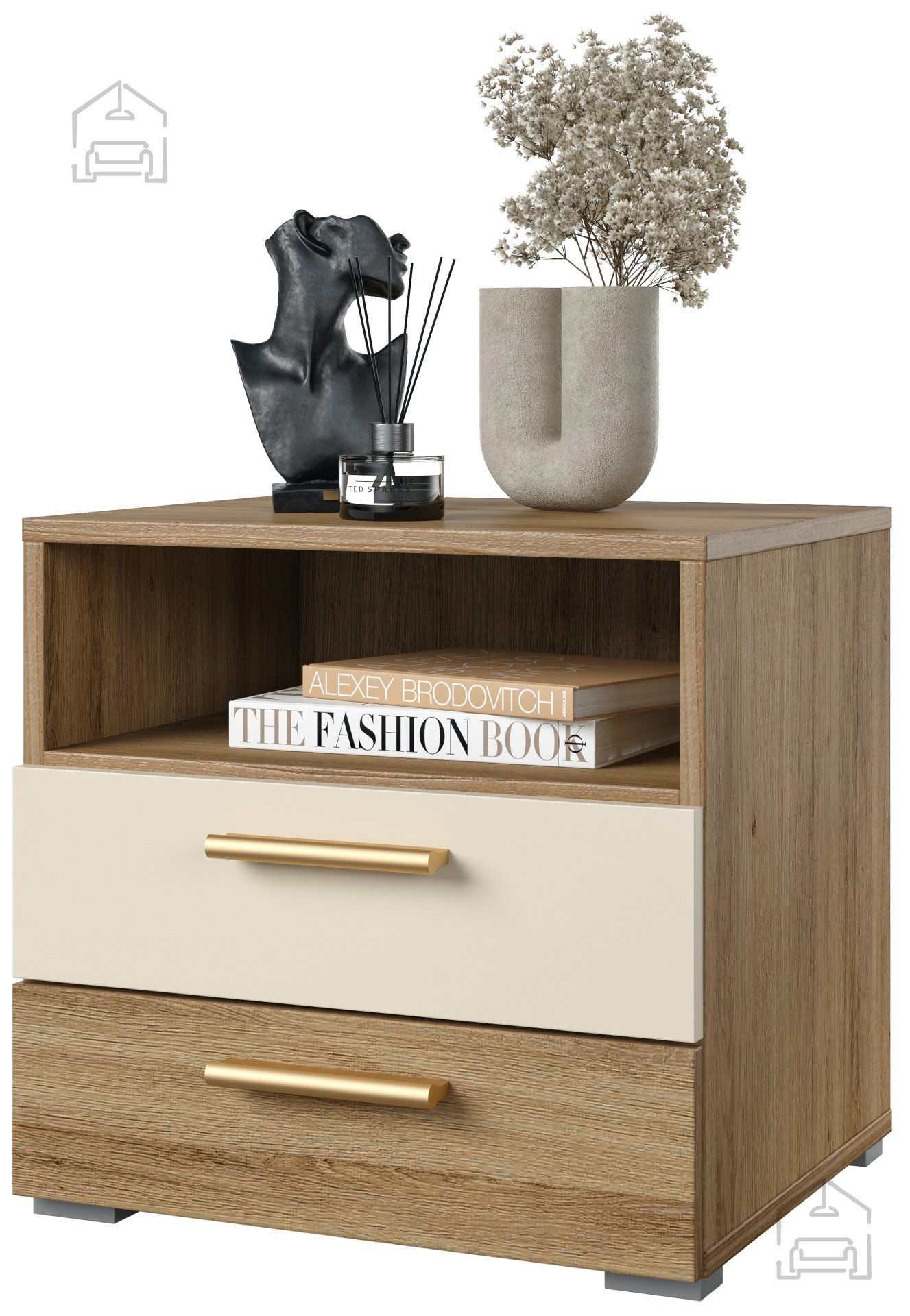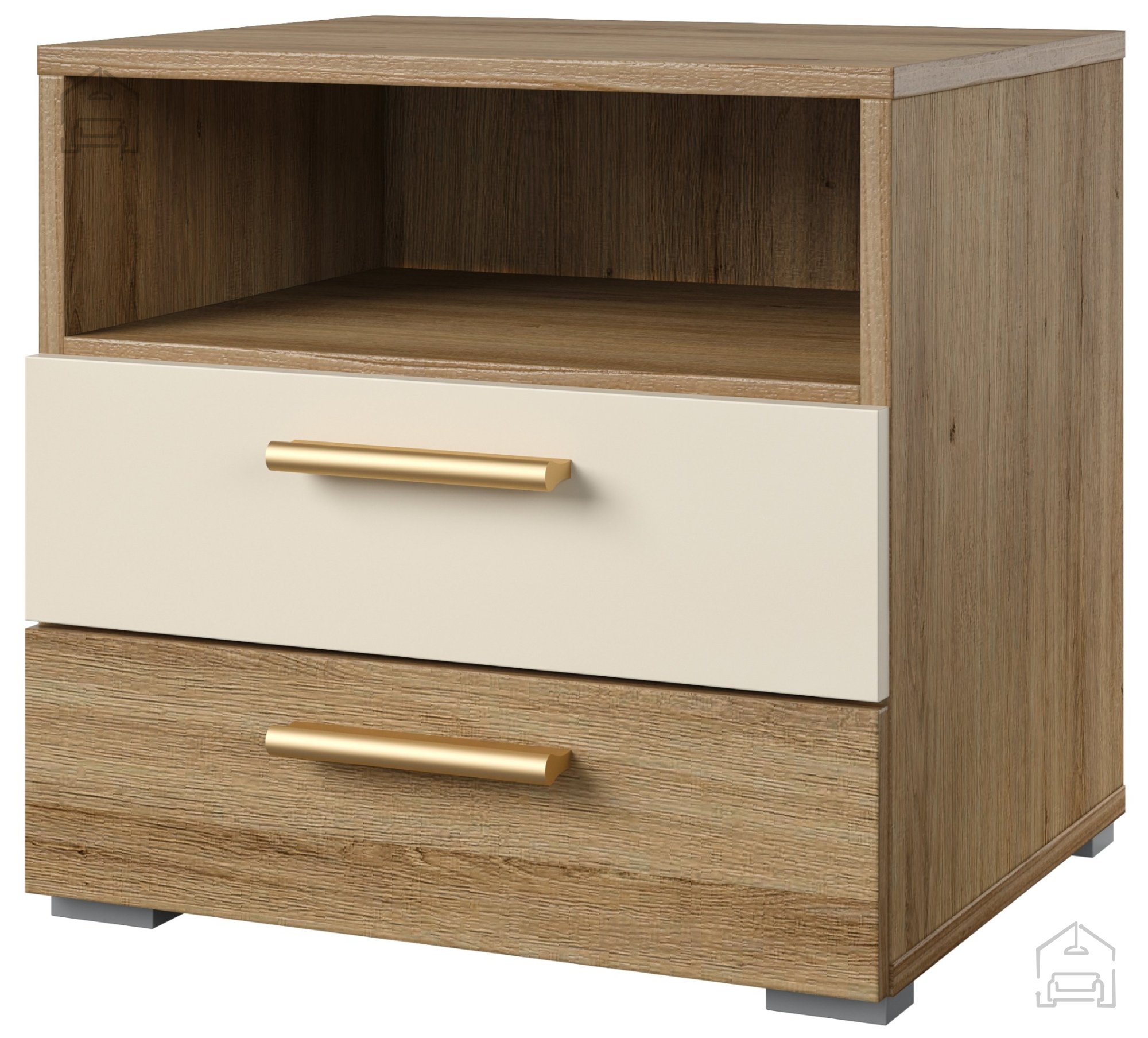 Der Nachttisch Vertina ist in einer wunderschönen Farbkombination Wildeiche/Wildeiche - Beige erhältlich, was ihn vielseitig für verschiedene Einrichtungsstile einsetzbar macht. Seine natürliche Farbe und die Holzoptik bringen Wärme und Behaglichkeit in Ihr Zuhause.
