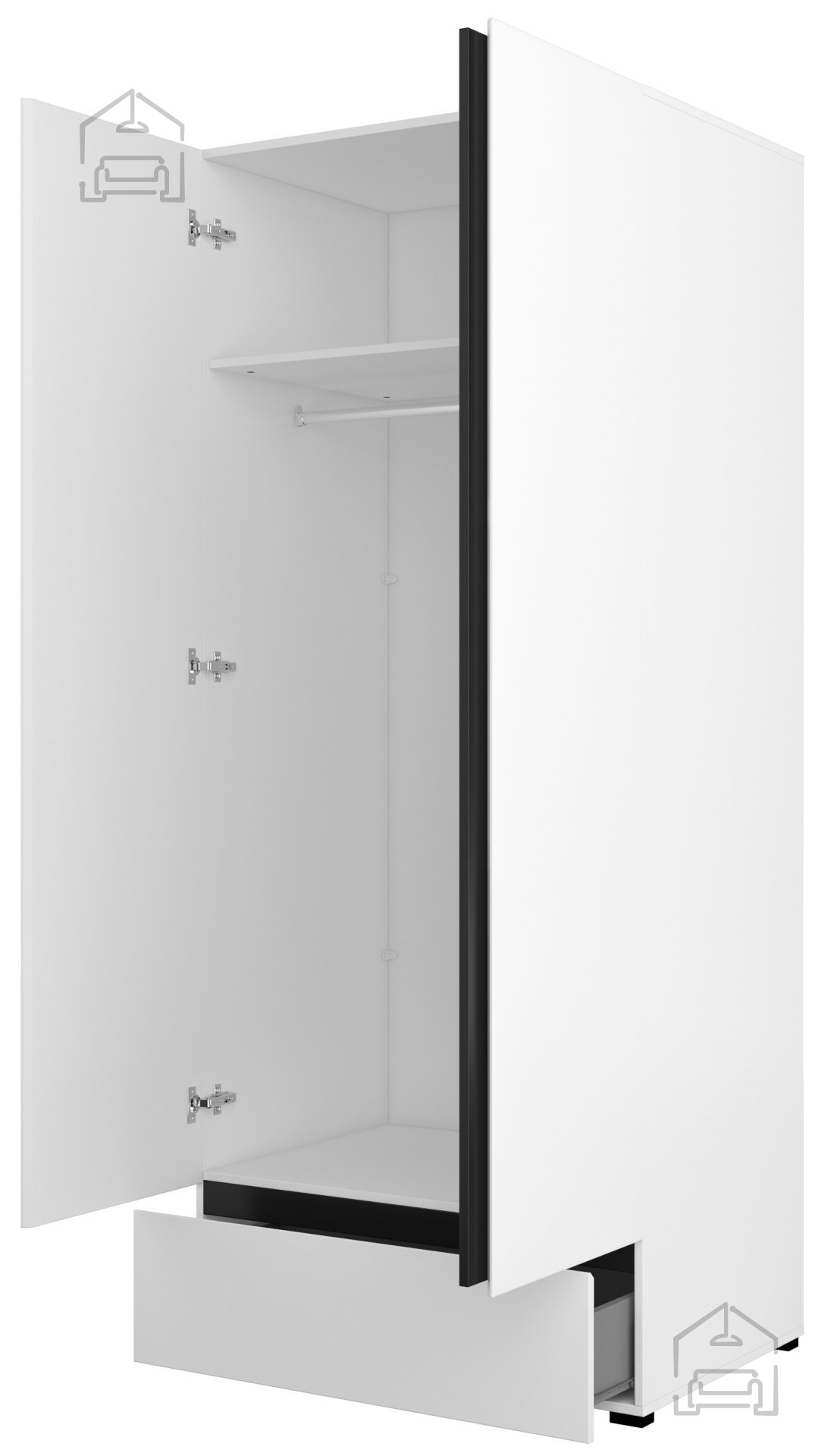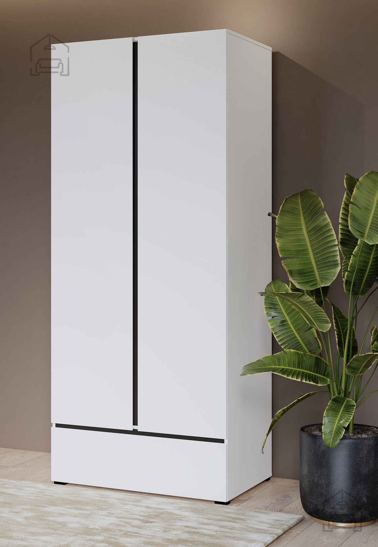 Der Kleiderschrank Cross S besteht aus einer Möbelplatte mit 15 mm Stärke, was Stabilität und Langlebigkeit gewährleistet. Die Rückwand ist aus einer HDF-Platte mit 3 mm Stärke gefertigt, was die Stabilität und Haltbarkeit zusätzlich erhöht. Die Kanten sind mit ABS-Kanten geschützt, die zusätzlichen Schutz vor Stößen und Beschädigungen bieten – ein wichtiger Vorteil für jeden Haushalt.