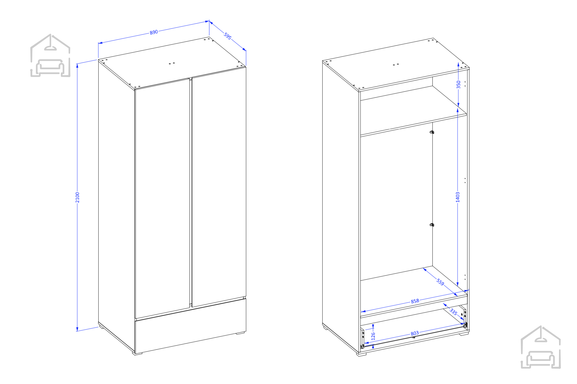 Der Kleiderschrank Cross S besteht aus einer hochwertigen Möbelplatte mit einer Stärke von 15 mm, was Langlebigkeit und Stabilität gewährleistet. Die Rückwand ist aus einer 3 mm starken HDF-Platte gefertigt, die die Struktur des Schranks zusätzlich verstärkt. Die Kanten sind mit ABS-Kanten geschützt, was die Stoßfestigkeit erhöht und die Lebensdauer der Möbel verlängert.
