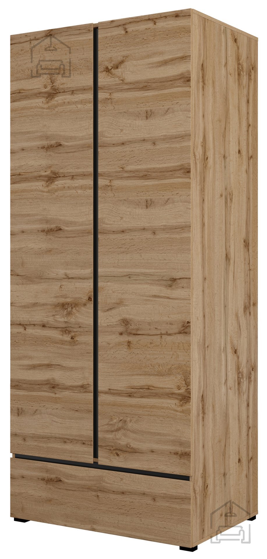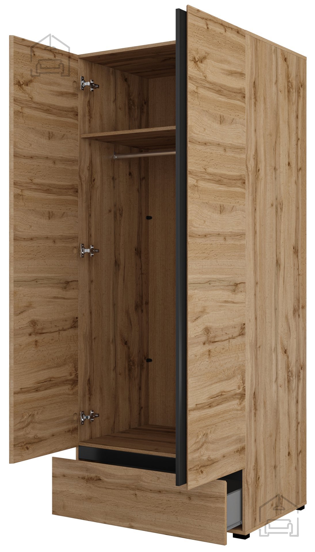 Der Kleiderschrank Cross S ist die ideale Lösung für jedes Zuhause, das ein Gleichgewicht zwischen Funktionalität und ästhetischem Erscheinungsbild sucht. Mit seinen Maßen 89x60x210 cm ist er so konzipiert, dass er den Raum optimiert und ausreichend Platz zur Aufbewahrung Ihrer Kleidung und Accessoires bietet. Sein Design in der Kombination Wotan-Eiche und Wotan-Eiche-Schwarz verleiht ihm ein modernes und elegantes Aussehen, das perfekt zu verschiedenen Einrichtungsstilen passt.