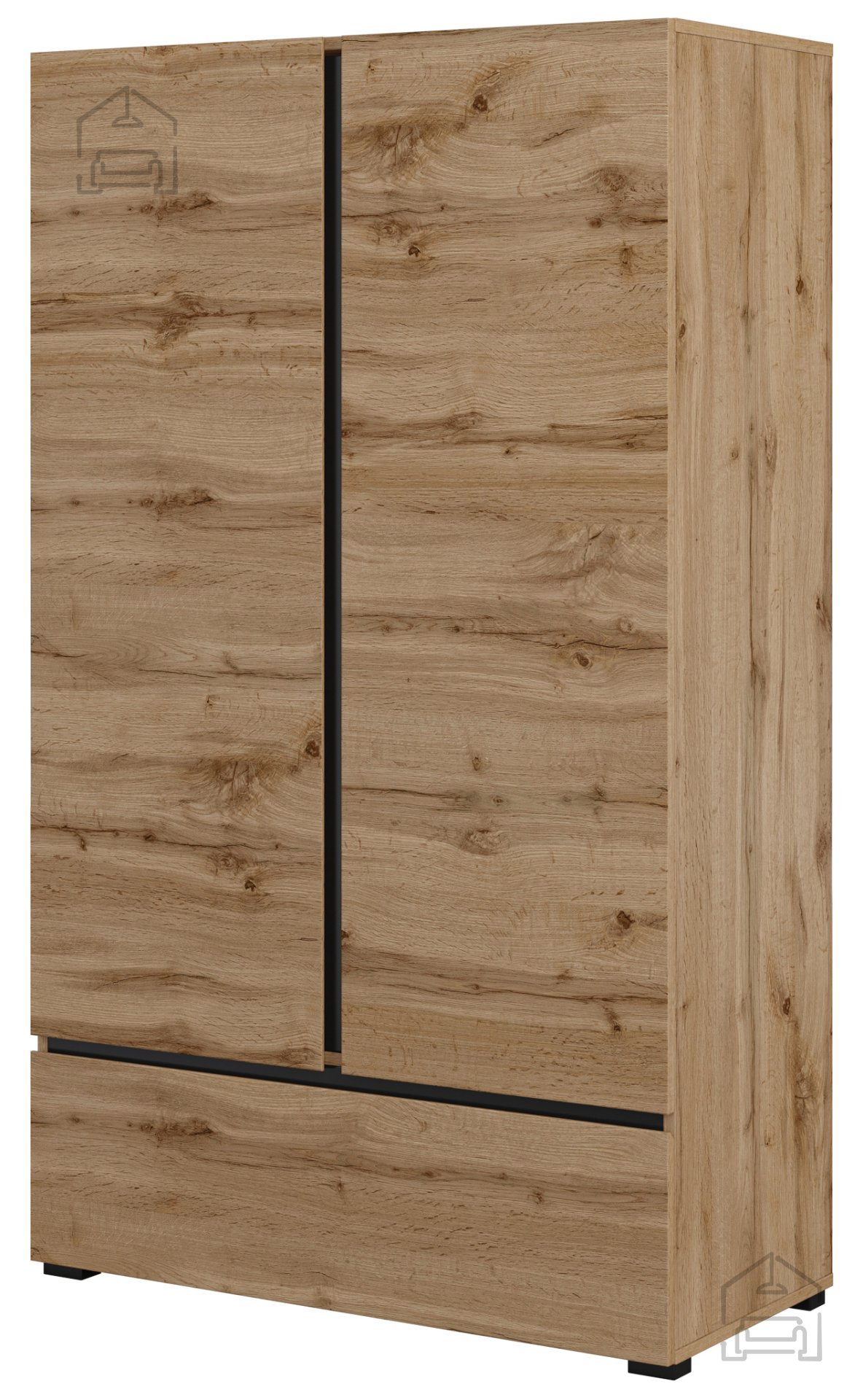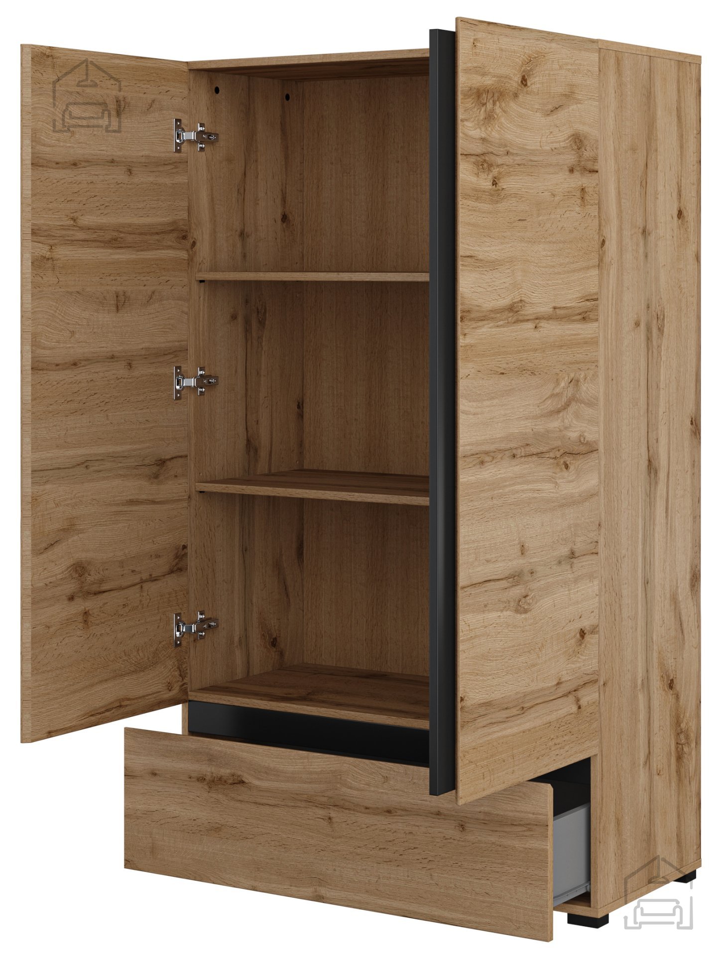 Der Schrank ist in einer attraktiven Kombination aus Eiche Votan/Eiche Votan-Schwarz erhältlich, die sich perfekt in verschiedene Inneneinrichtungen einfügt. Egal, ob Sie einen klassischen oder modernen Look bevorzugen – dieser Schrank erfüllt Ihre Erwartungen und verleiht Ihrem Wohnzimmer, Schlafzimmer oder Flur zusätzlichen ästhetischen Wert.