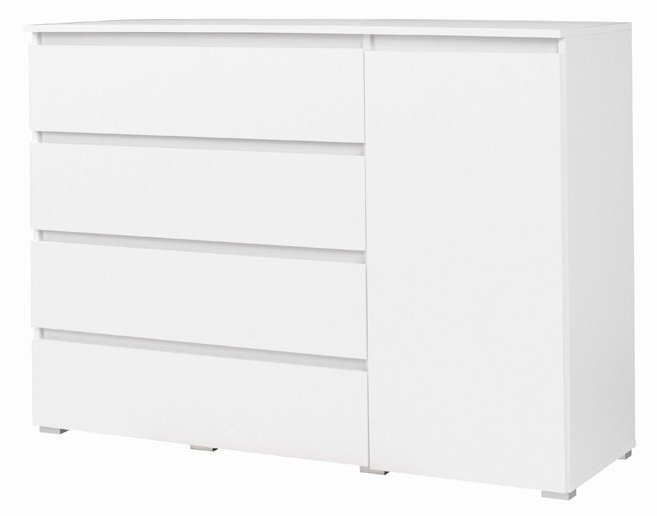 Die Kommode Cosmo C05 misst 138x41x97 cm, was bedeutet, dass sie ausreichend Stauraum bietet, ohne dabei zu viel Platz in Ihrem Zimmer einzunehmen. Sie besteht aus einer hochwertigen laminierten Platte mit einer Stärke von 16 mm, was Langlebigkeit und Widerstandsfähigkeit gegen täglichen Gebrauch garantiert. Die Kanten sind mit ABS-Kantenband geschützt, was die Haltbarkeit zusätzlich erhöht und Beschädigungen verhindert.
