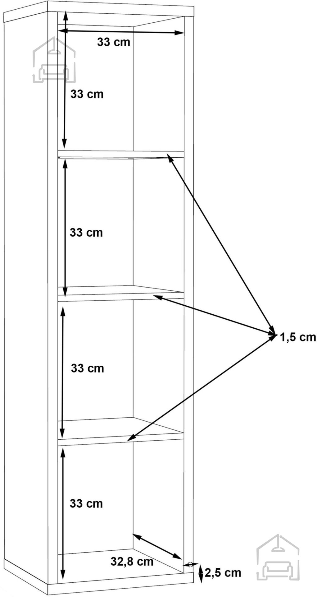Der Regalschrank Mauro ist mit drei Regalböden ausgestattet, von denen jeder bis zu 8 kg tragen kann. Die offenen Fächer sind 33 cm breit und hoch sowie 32,8 cm tief, was ausreichend Platz für Bücher, Dekorationsartikel oder Büromaterial bietet. Dank seines Designs eignet sich das Produkt für verschiedene Verwendungszwecke, von der Aufbewahrung bis zur Präsentation persönlicher Gegenstände.