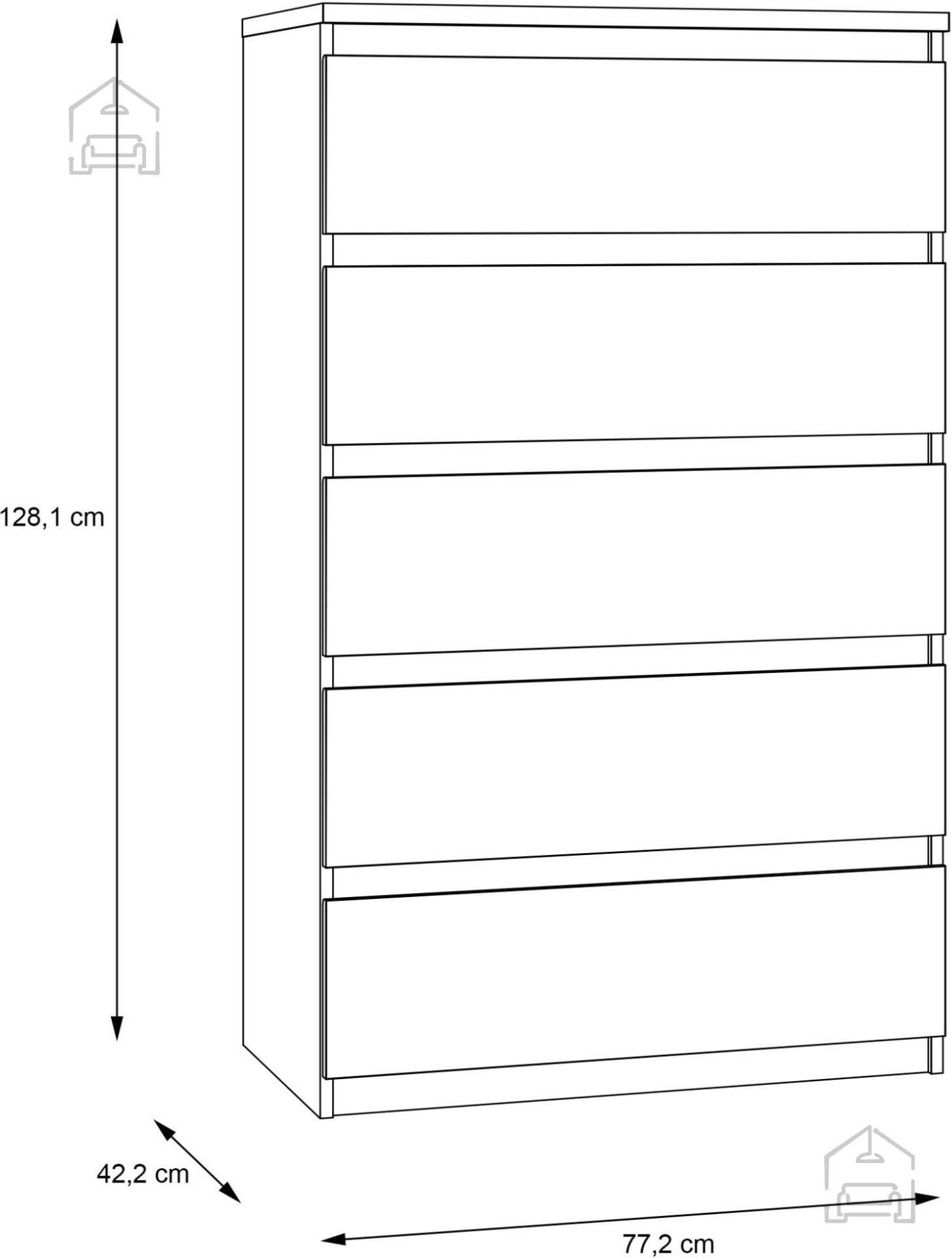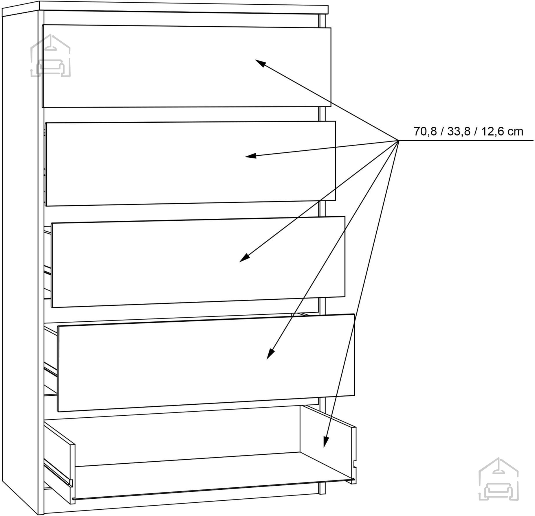 Die Kommode Chelsea verfügt über fünf identische, grifflose Schubladen, die mit kugelgelagerten Schienen ausgestattet sind. Dieses System ermöglicht ein reibungsloses Öffnen und Schließen der Schubladen und bietet ausreichend Stauraum für Kleidung, Accessoires oder Haushaltsgegenstände. Jede Schublade hat eine maximale Tragfähigkeit von 5 kg, was für die meisten Ihrer Bedürfnisse mehr als ausreichend ist.