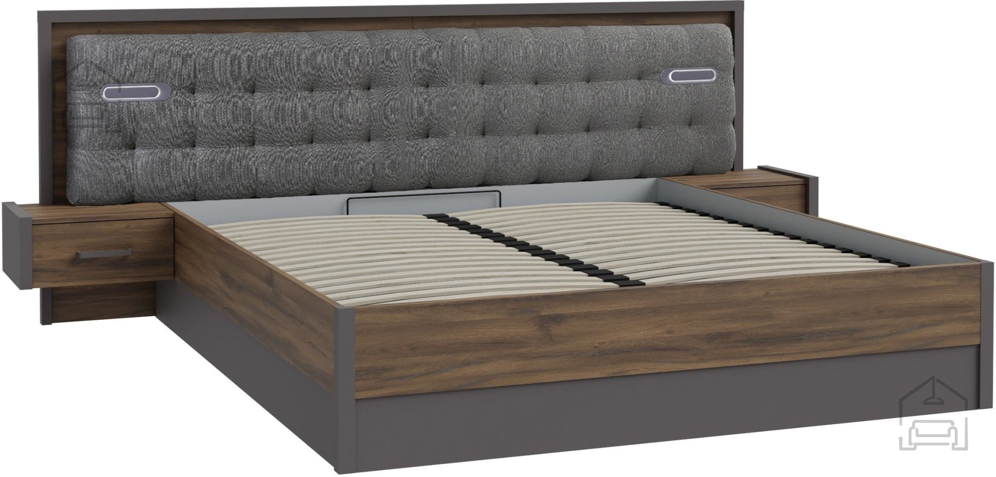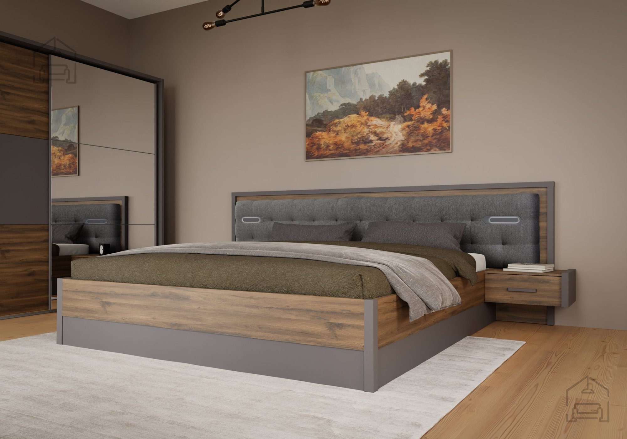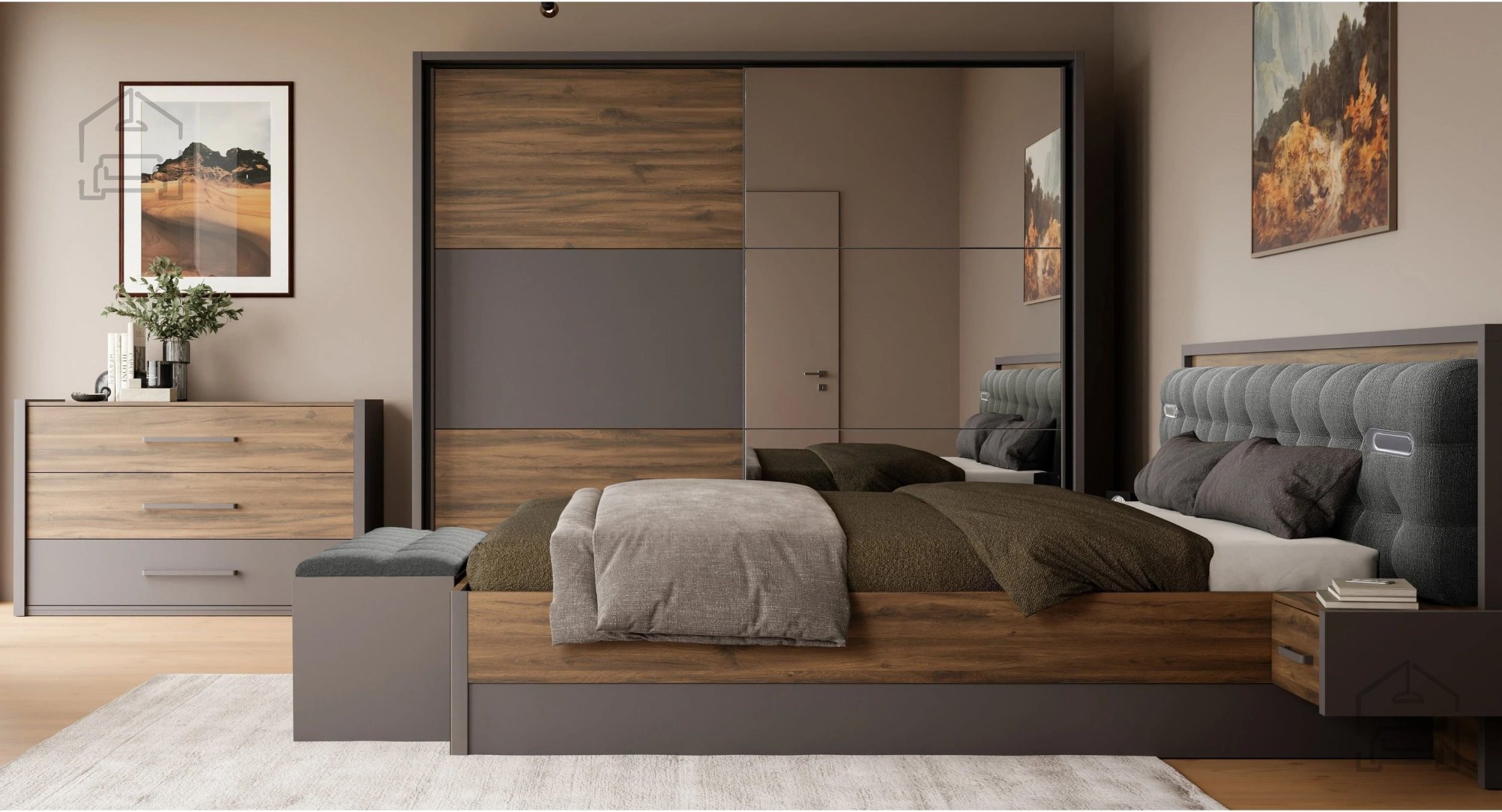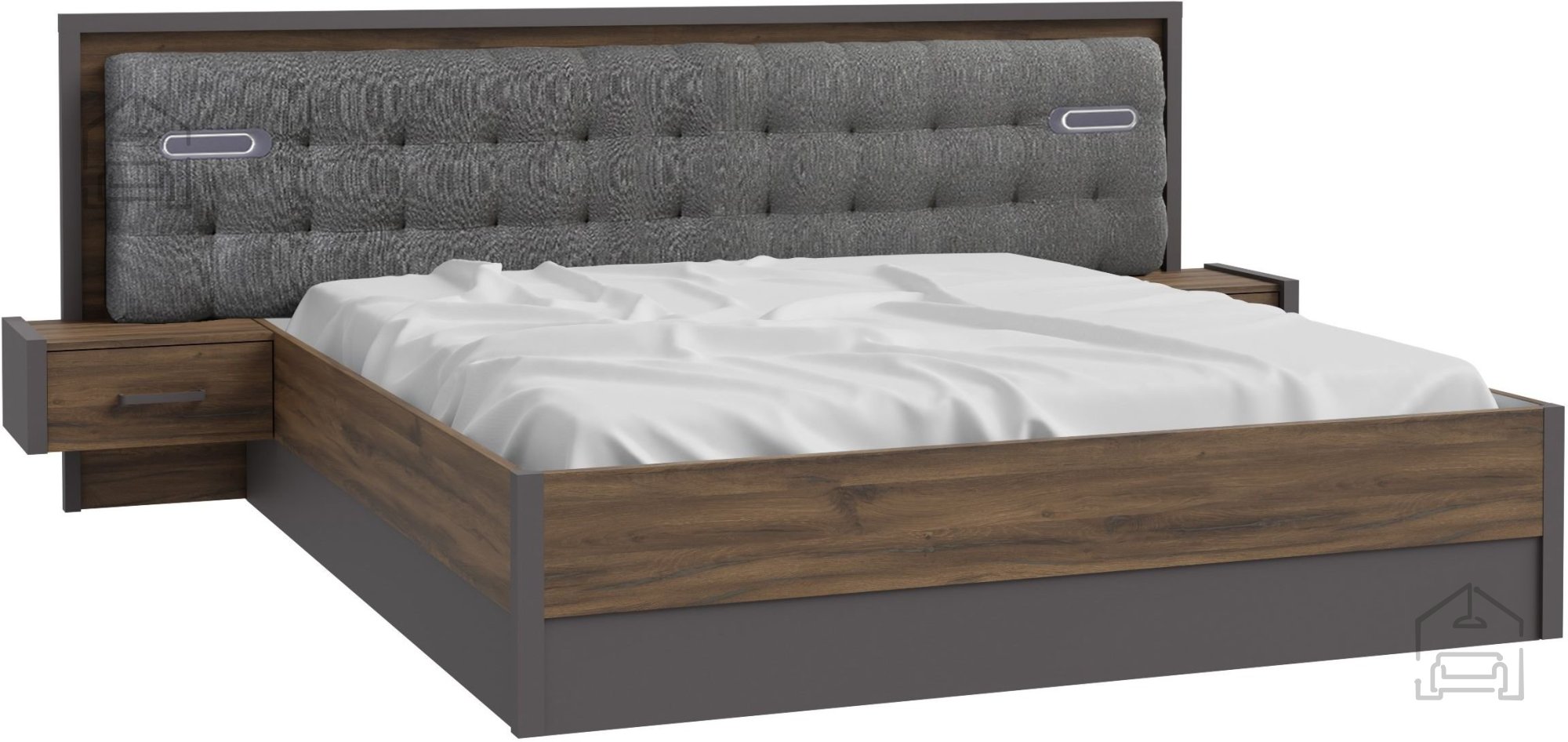 Großes Bett in dunkler Eichenfarbe mit grauen Details, ausgestattet mit einem gepolsterten Kopfteil und zwei Kommoden an den Seiten, die als Nachttische dienen. Die Liegefläche ist für Matratzen der Größe 180x200 cm vorgesehen. Die große gepolsterte Kopfplatte sorgt für zusätzlichen Komfort beim Schlafen und Anlehnen, gepolstert und mit dekorativen Nähten im quadratischen Muster versehen. Vom Boden bis zur Oberkante ist sie 103 cm hoch und 258 cm breit.