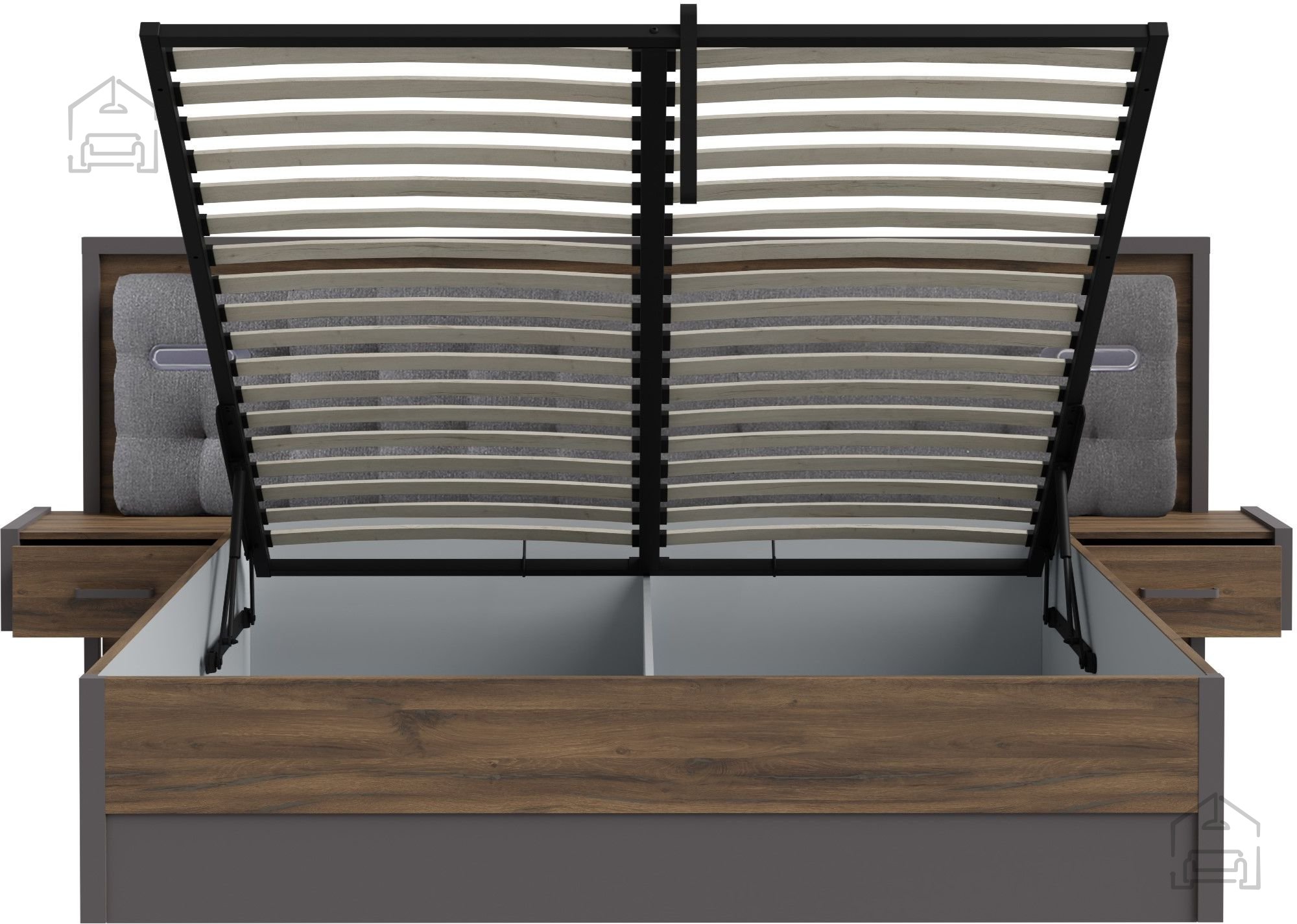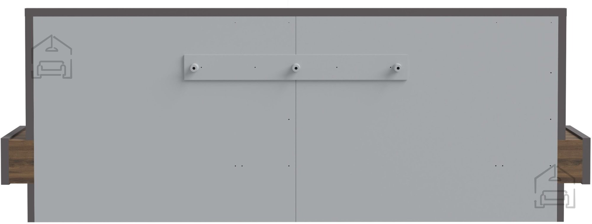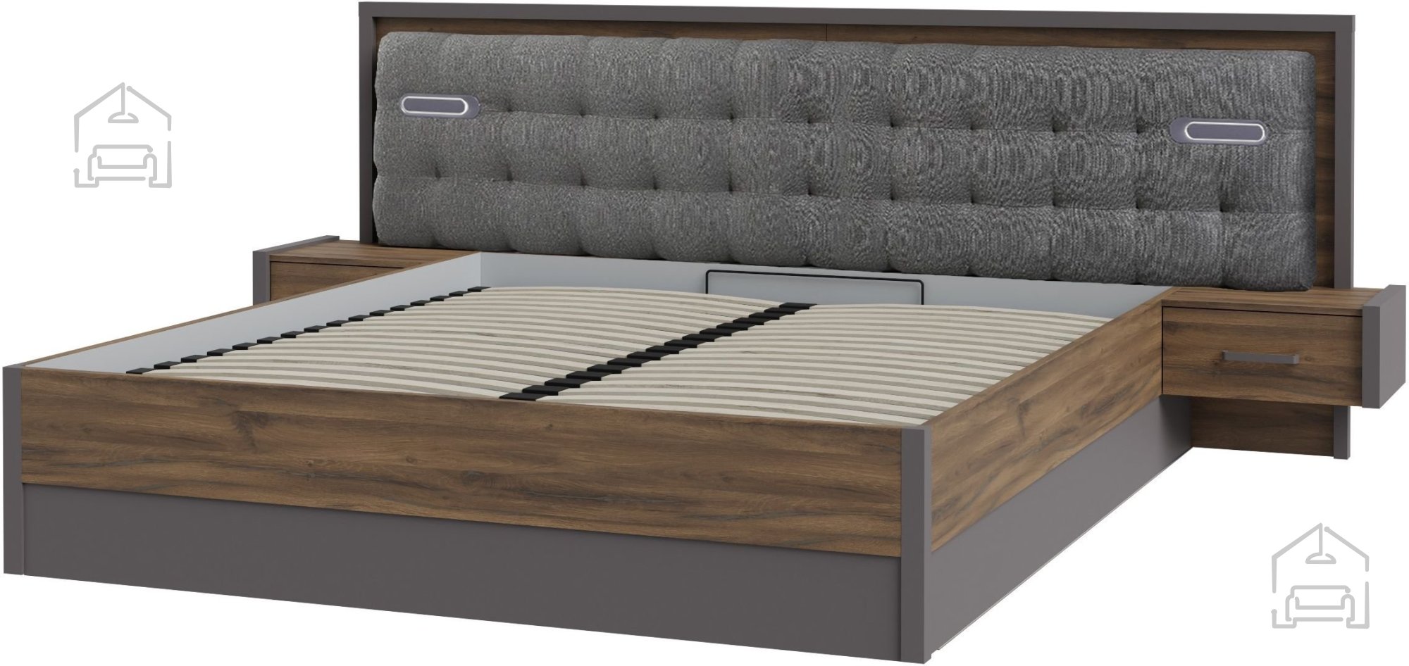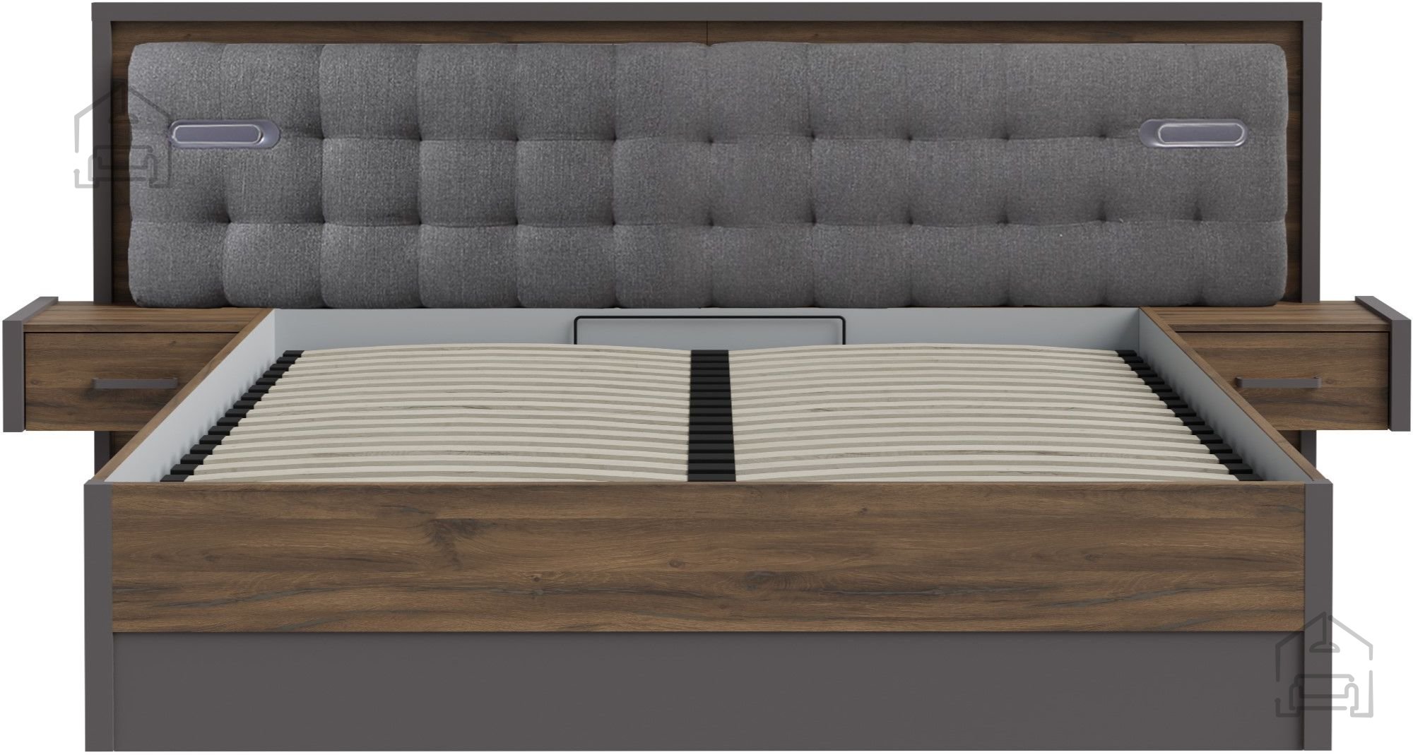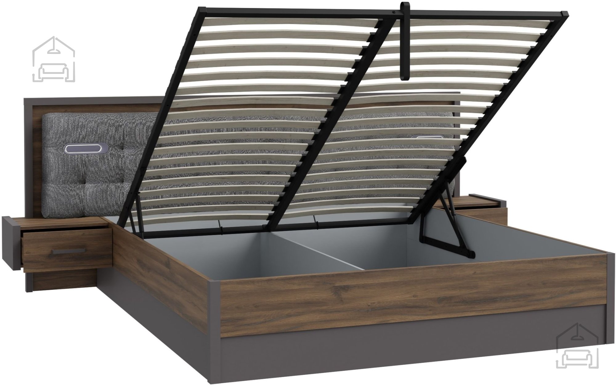 Großes Bett in dunkler Eichenfarbe mit grauen Details, ausgestattet mit einem gepolsterten Kopfteil und zwei Kommoden an den Seiten, die als Nachttische dienen. Die Liegefläche ist für Matratzen der Größe 180x200 cm vorgesehen. Die große gepolsterte Kopfplatte sorgt für zusätzlichen Komfort beim Schlafen und Anlehnen, gepolstert und mit dekorativen Nähten im quadratischen Muster versehen. Vom Boden bis zur Oberkante ist sie 103 cm hoch und 258 cm breit.
