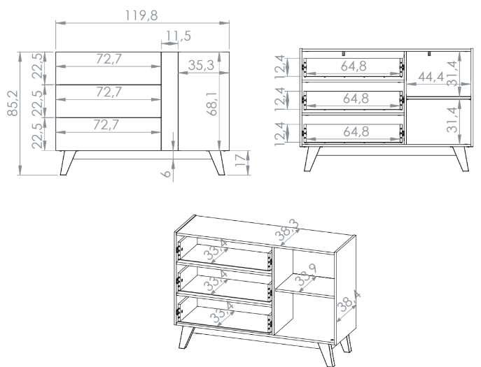 Die Kommode Freshion 04 ist sorgfältig mit den Maßen 120x40x85 cm gestaltet und eignet sich ideal für verschiedene Räume, vom Wohnzimmer bis zum Schlafzimmer. Sie besteht aus hochwertigem MDF-Material und laminierten Spanplatten, die Langlebigkeit und eine lange Lebensdauer des Produkts gewährleisten. Dank der erstklassigen Verarbeitung in der Fabrik ML Meble in Polen können Sie auf ihre Qualität und Beständigkeit vertrauen.