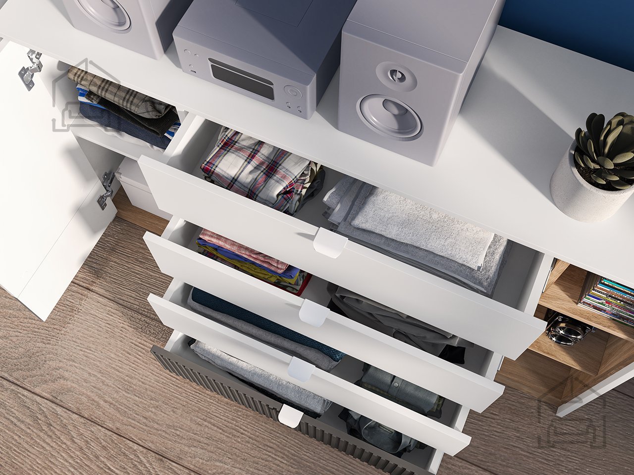 2. Praktische Nutzbarkeit: Die großzügigen Maße und die durchdachte Anordnung von Schubladen und Regalen ermöglichen eine optimale Aufbewahrung all Ihrer Gegenstände, von Kleidung bis hin zu wichtigen Dokumenten.