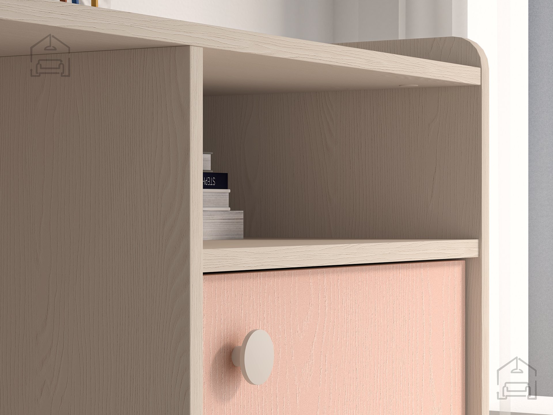 Der Mevel 07 besticht durch eine charmante Farbkombination, die Frische und Lebendigkeit in jeden Raum bringt. Die Front des Schreibtisches ist in der trendigen Farbe Millennial Pink gehalten, die subtile Eleganz und Modernität vermittelt, während der Korpus in der raffinierten Farbe Desert Sand ausgeführt ist, was eine einfache Abstimmung mit anderen Möbelstücken und Dekorationen in Ihrem Zuhause ermöglicht.