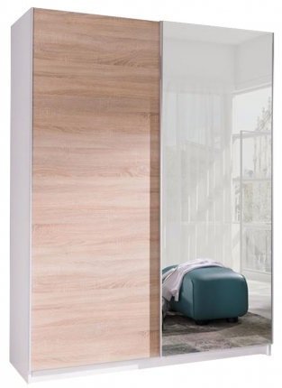 Der Schrank ist sorgfältig in einer eleganten Farbkombination gestaltet. Der Korpus ist in zeitlosem Weiß gehalten, das sich mühelos in verschiedene Einrichtungsstile einfügt. Türen in Sonoma-Eiche-Farbe verleihen Wärme und eine natürliche Optik, während der Spiegel an den Türen für eine optische Vergrößerung des Raumes sowie zusätzliche Praktikabilität sorgt.