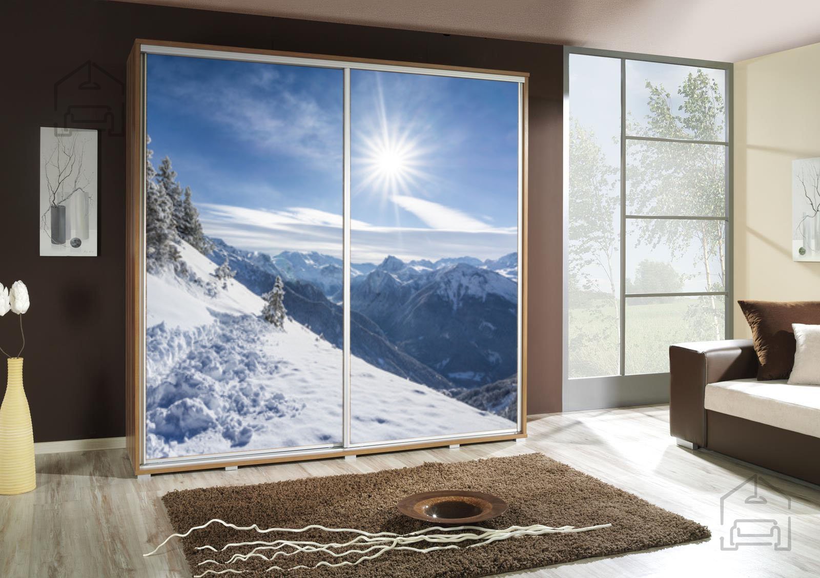 Die Schiebetüren sparen nicht nur Platz, sondern verleihen auch einen Hauch von Modernität und Eleganz. Aluminiumdetails und die hochwertige Schiebetür-Technologie SEVROLL sorgen dafür, dass jedes Öffnen und Schließen des Schranks reibungslos und mühelos erfolgt. Darüber hinaus verleiht die Grafik Winter 2 ein einzigartiges visuelles Element, das Aufmerksamkeit erregt und Ihr Zimmer belebt.