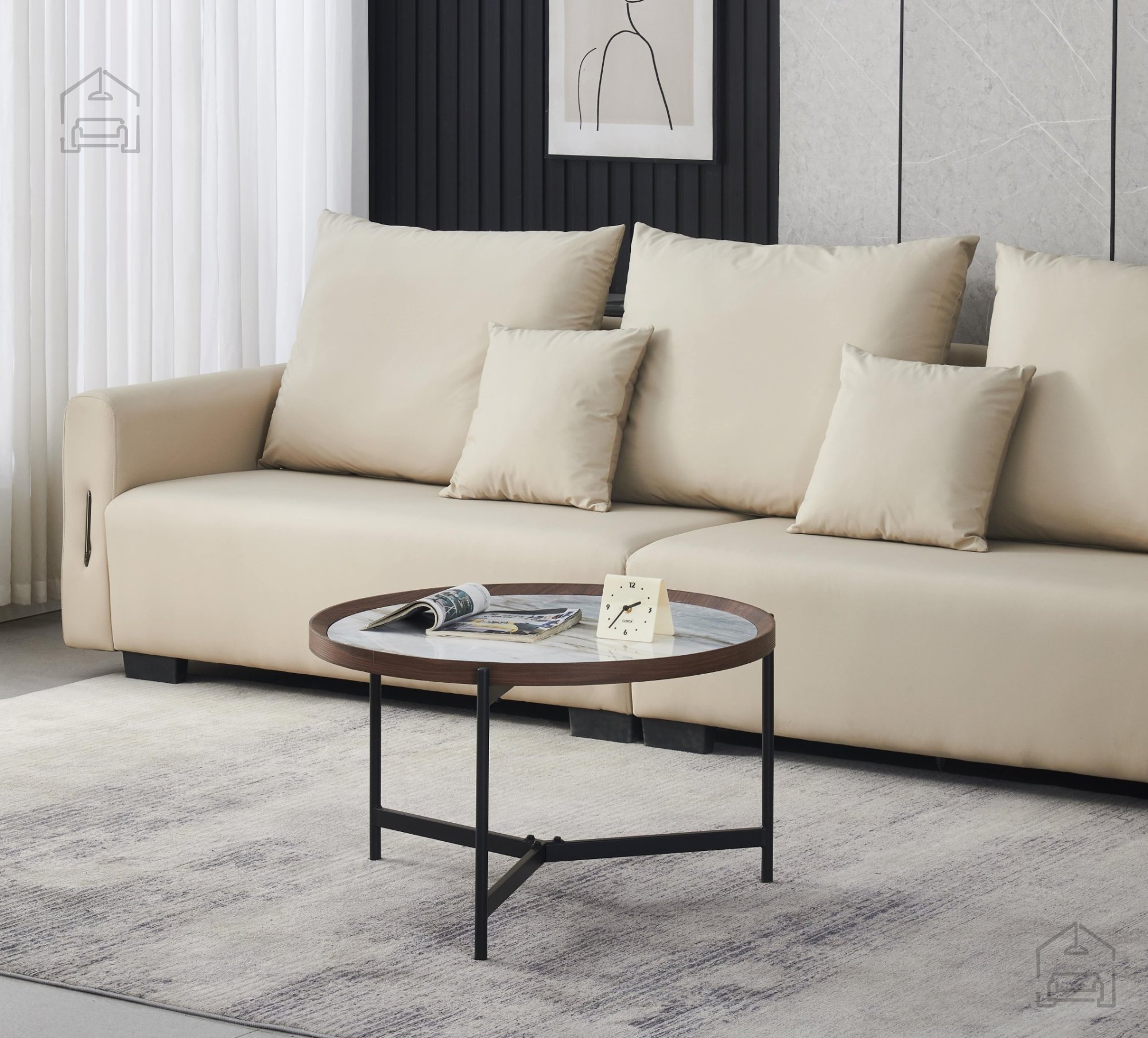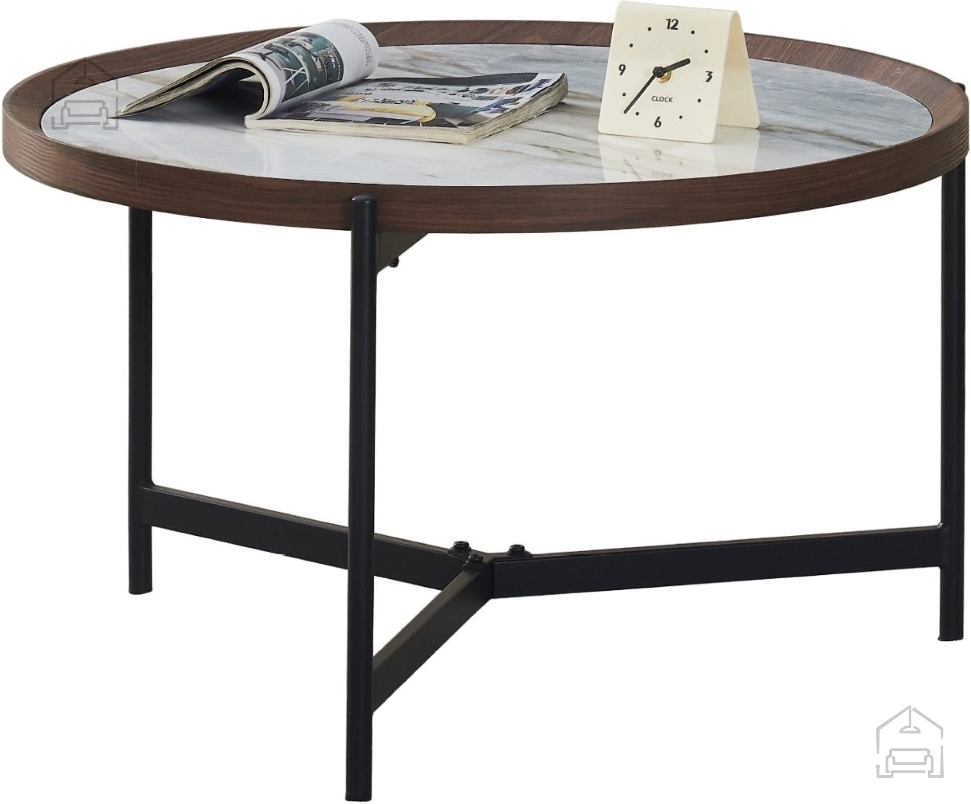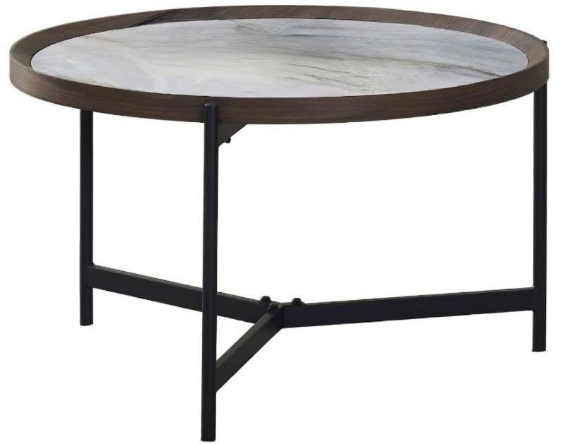 Interessanter runder Couchtisch, der sich mit seiner Kombination aus spannendem Design und Funktionalität hervorragend in moderne Wohnräume einfügt. Die Tischplatte besteht aus 6 mm dicker, glänzend blau-weißer Keramik mit einem Rahmen aus MDF-Material mit Papierfurnier.