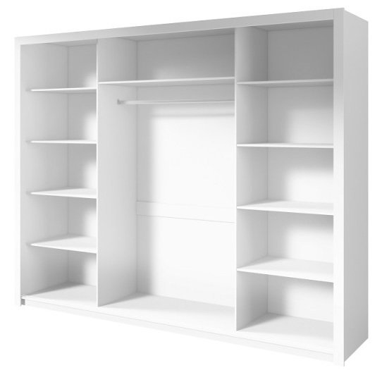 Wir präsentieren Ihnen den eleganten und geräumigen Kleiderschrank mit Schiebetüren Frama mit den Maßen 255x60x206 cm. Dieser moderne Schrank ist so gestaltet, dass er sich perfekt in Ihr Zuhause einfügt, unabhängig vom Einrichtungsstil. Hergestellt aus hochwertiger, 16 mm dicker, laminierter Platte ist dieser Schrank eine langlebige und zuverlässige Wahl für den täglichen Gebrauch.