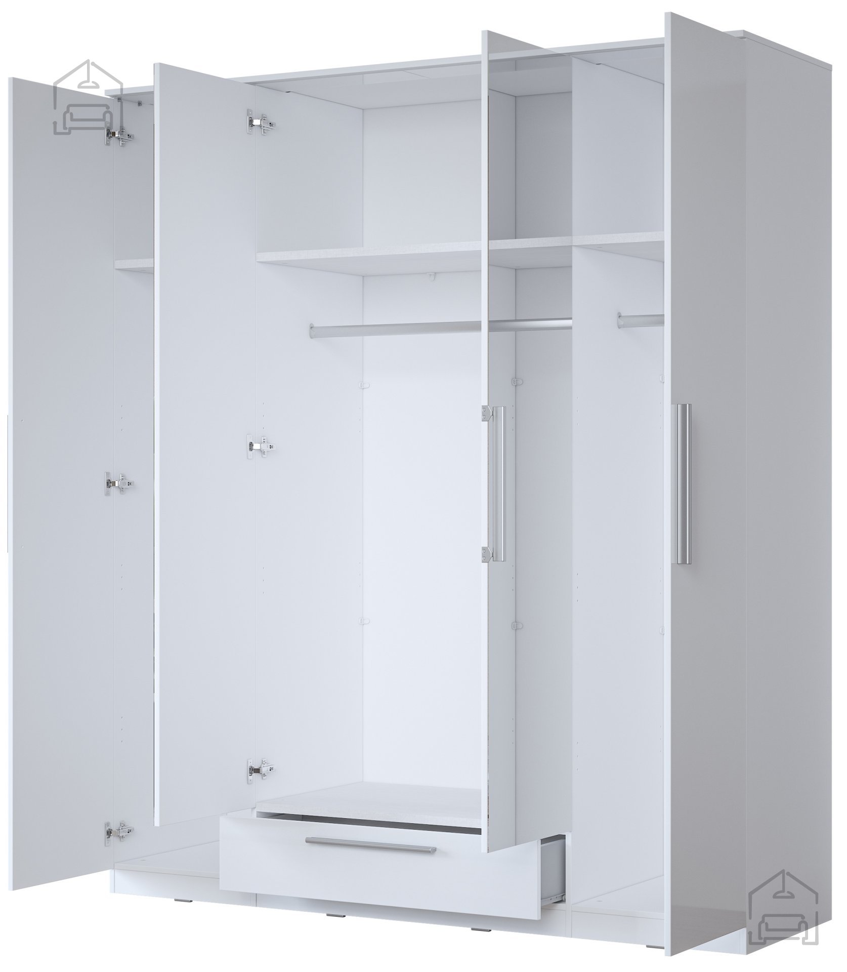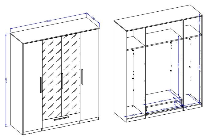 Der Schrank ist mit Blick auf den Benutzer konzipiert. Er bietet vier Türen und eine Schublade, was eine optimale Organisation Ihrer Kleidung, Schuhe und Accessoires ermöglicht. Jeder Teil des Schranks ist sorgfältig durchdacht, um Ihnen maximalen Stauraum zu bieten, sodass Ihre Garderobe stets ordentlich und übersichtlich bleibt.