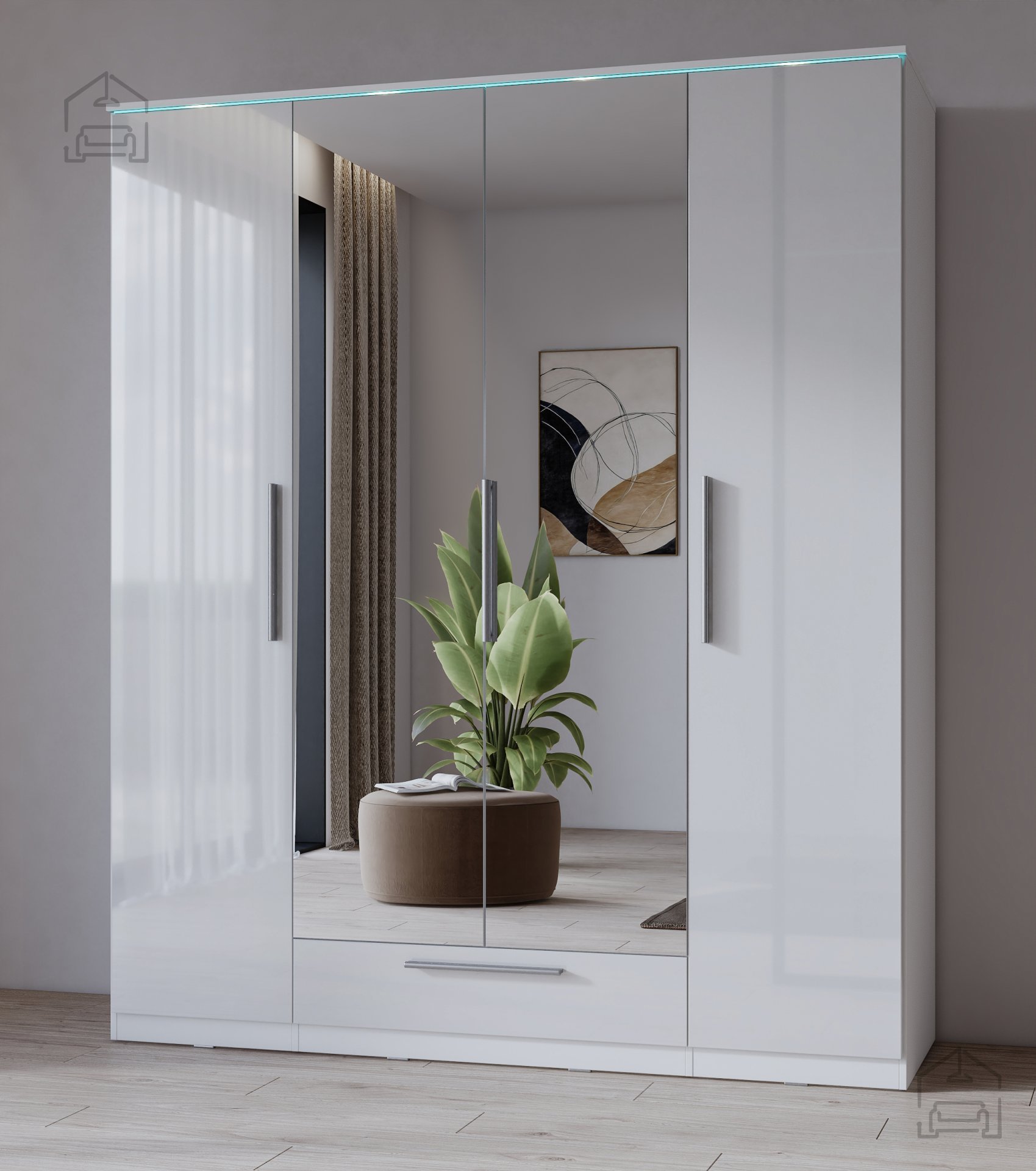 Der Kleiderschrank India S ist mit seiner glänzend weißen Farbe ein echter Blickfang, der jeden Raum erfrischt und belebt. Die dezent integrierte RGB-Beleuchtung schafft eine angenehme Atmosphäre und lässt den Schrank in verschiedenen Farbtönen erstrahlen, sodass Sie die Beleuchtung je nach Stimmung oder Anlass anpassen können. Zwei integrierte Spiegel erfüllen nicht nur ihren praktischen Zweck, sondern vergrößern den Raum optisch und verleihen ihm einen Hauch von Prestige.